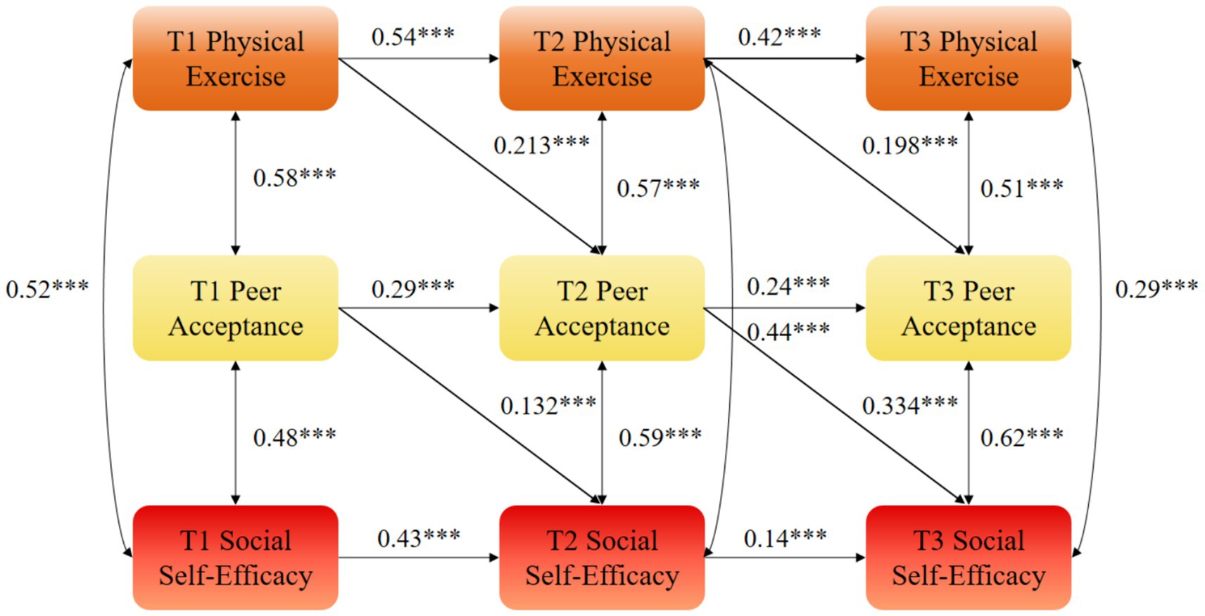 Figure 3. Autoregressive model M2 of physical exercise, peer acceptance, and social self-efficacy. ***statistical significance at the level of p < 0.01.