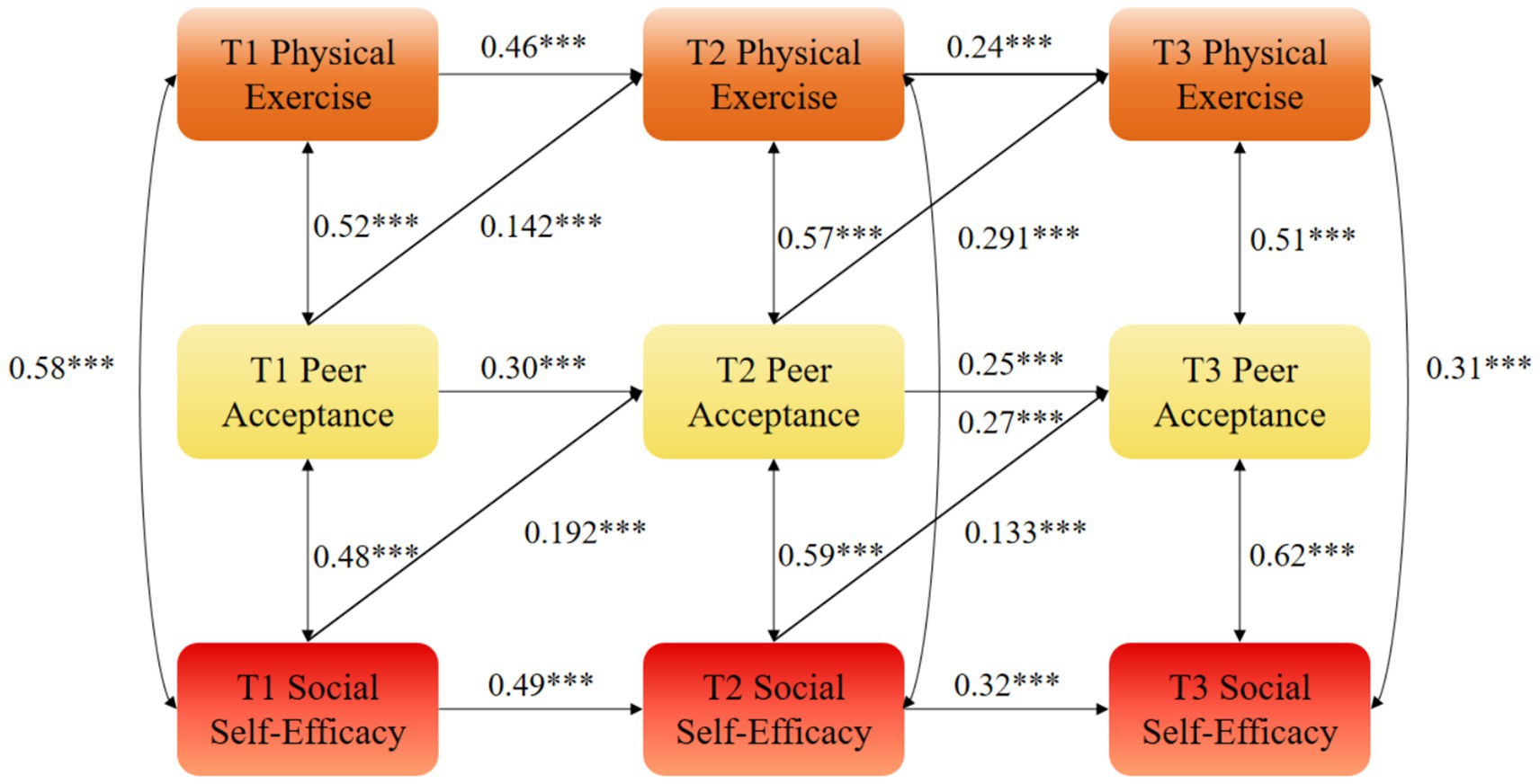 Figure 4. Autoregressive model M3 of physical exercise, peer acceptance, and social self-efficacy. ***statistical significance at the level of p < 0.01.