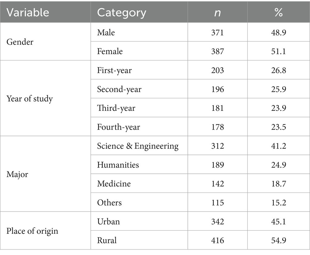 Invalid responses were excluded based on the following criteria: (1) more than two-thirds of items unanswered; (2) failure to pass logical consistency checks; (3) patterned responding (e.g., selecting the same option for all items); and (4) incomplete demographic information. Ultimately, 758 participants completed all three surveys with matched data, yielding an attrition rate of 10.51%, primarily due to internships, leaves of absence, or transfers.