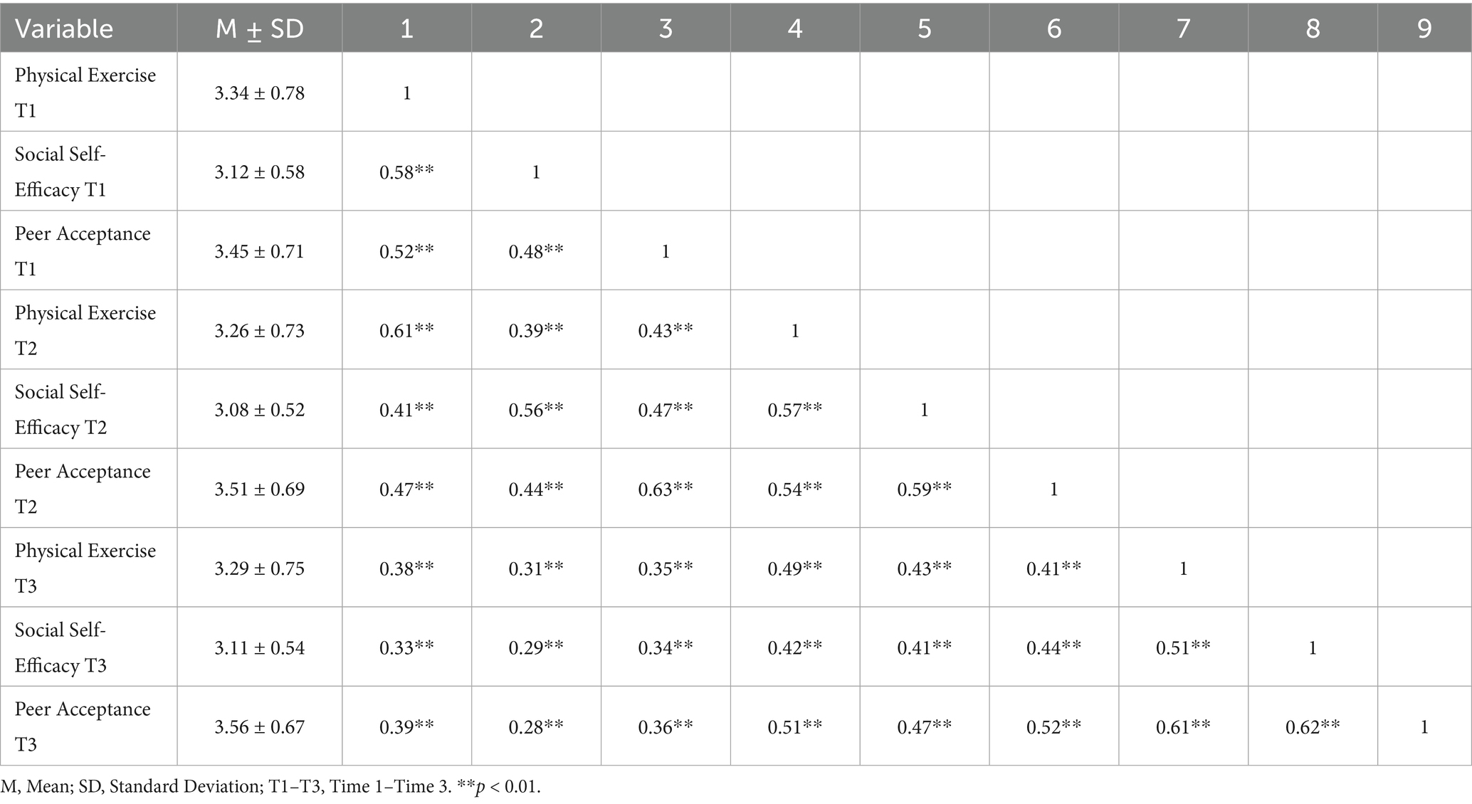 Table 2 presents the means, standard deviations, and Pearson correlation coefficients of physical exercise, social self-efficacy, and peer acceptance at all three measurement points. The results revealed that physical exercise at T1, T2, and T3 was significantly positively correlated with social self-efficacy and peer acceptance at the same and subsequent time points (p < 0.01). Similarly, social self-efficacy was significantly positively correlated with peer acceptance across the three waves (p < 0.01).
