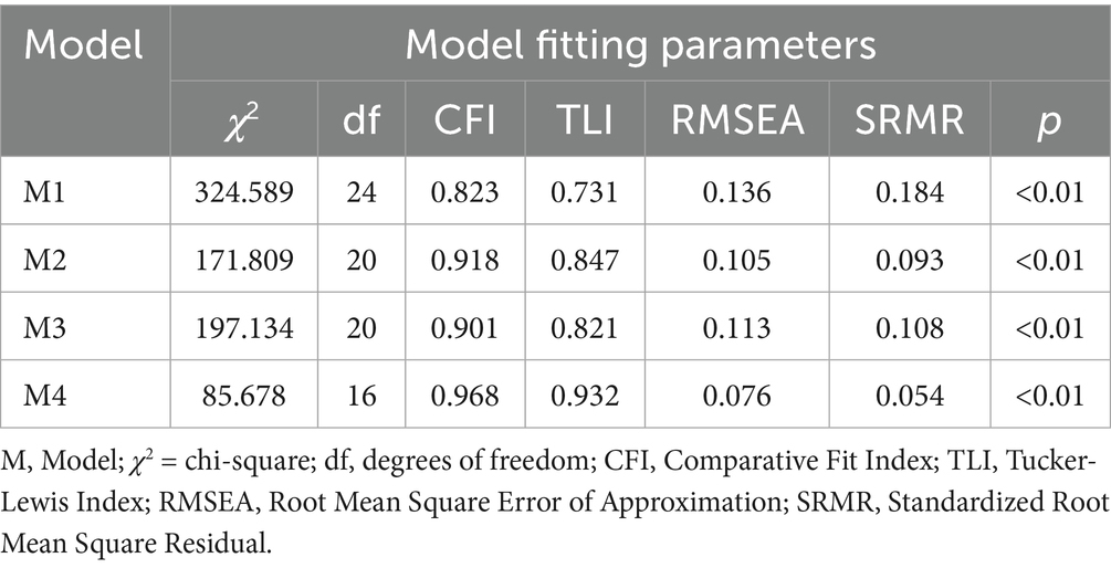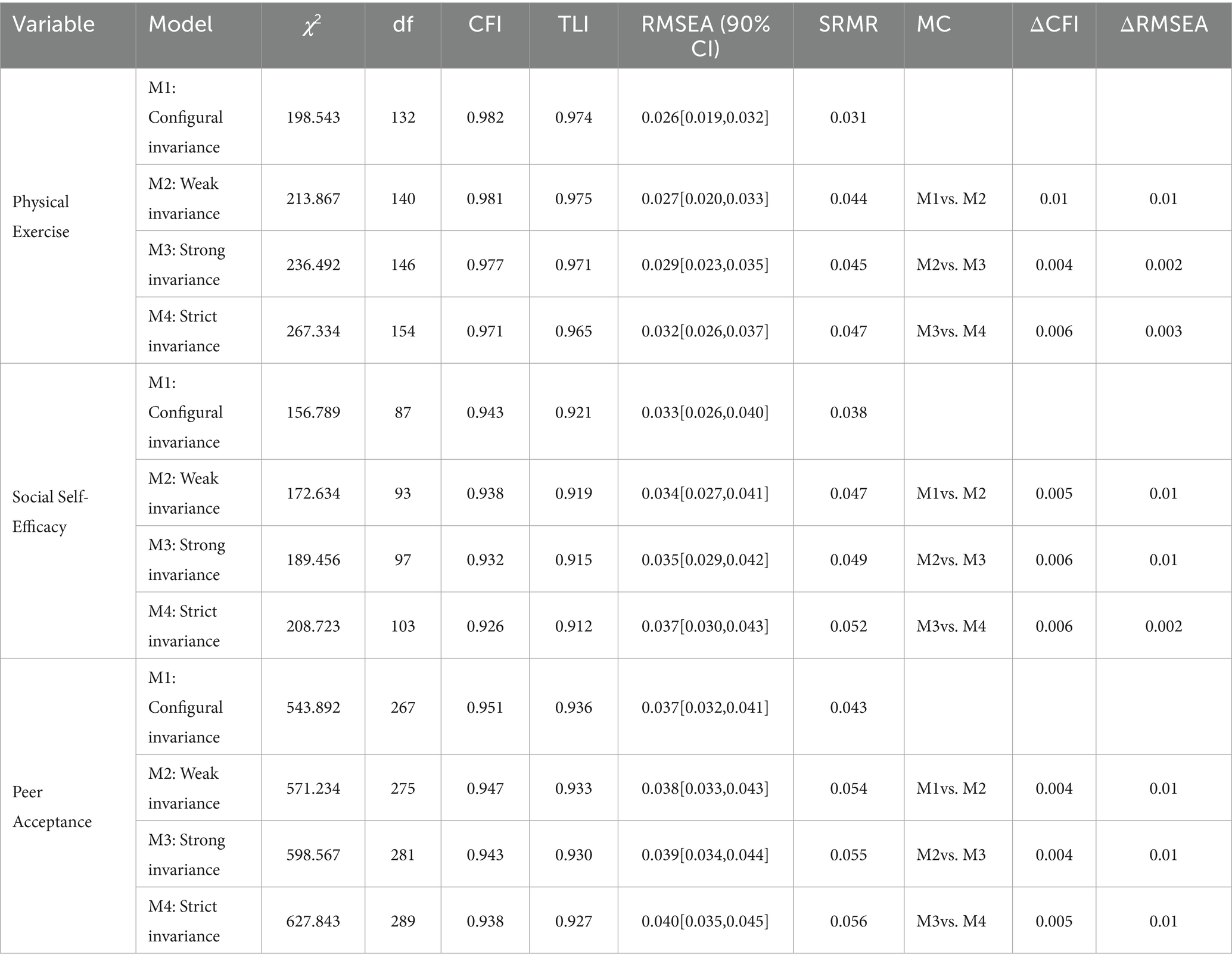 A longitudinal measurement invariance test was conducted to examine the cross-time stability of the Physical Exercise Scale, Social Self-Efficacy Scale, and Peer Acceptance Scale. Following the criteria proposed by Cheung et al. (ΔCFI ≤ 0.01 and ΔRMSEA ≤ 0.015) and adopting the item parceling strategy recommended by Wu et al. to simplify the model, we sequentially tested configural invariance (M1), weak invariance (M2), strong invariance (M3), and strict invariance (M4).