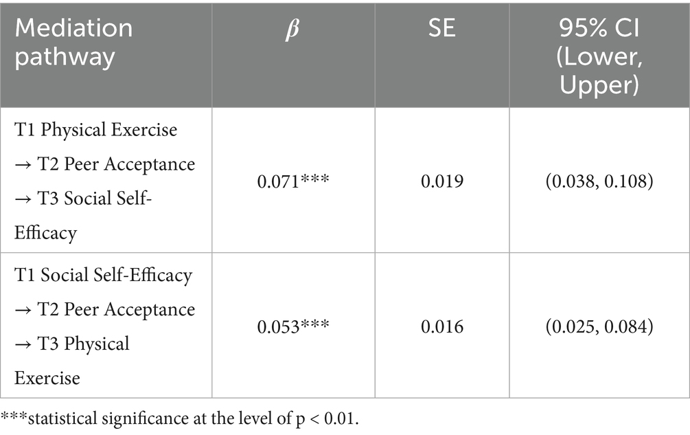 Peer acceptance plays a significant longitudinal mediating role in both directions of the relationship between physical exercise and social self-efficacy. Specifically, physical exercise at Time 1 predicts higher social self-efficacy at Time 3 through increased peer acceptance at Time 2 [β = 0.071, 95% CI (0.038, 0.108)], while social self-efficacy at Time 1 predicts greater participation in physical exercise at Time 3 through the same mediator [β = 0.053, 95% CI (0.025, 0.084)]. This finding highlights the central role of interpersonal relationships in realizing the psychological benefits of physical activity.