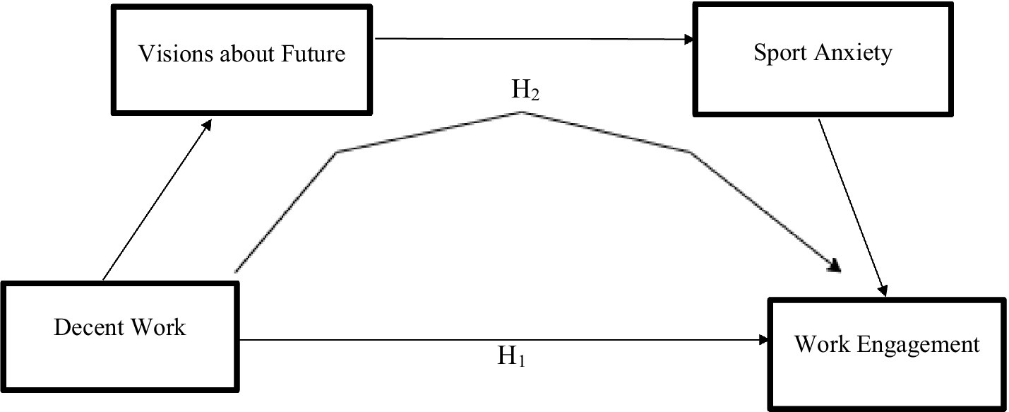 H2: The relationship between decent work and work engagement is serially mediated by visions about future (hope, optimism, and pessimism) and sport anxiety.
