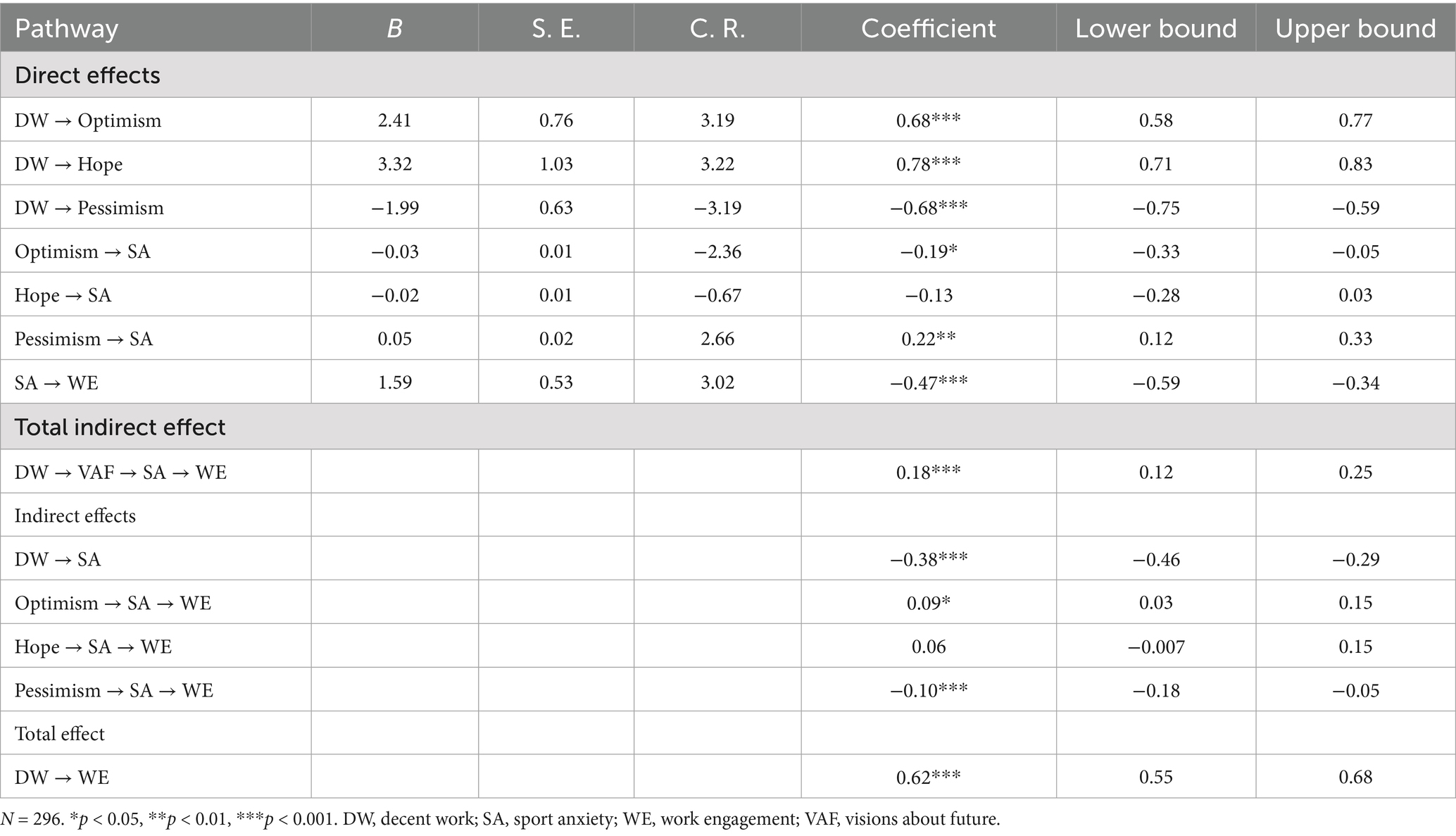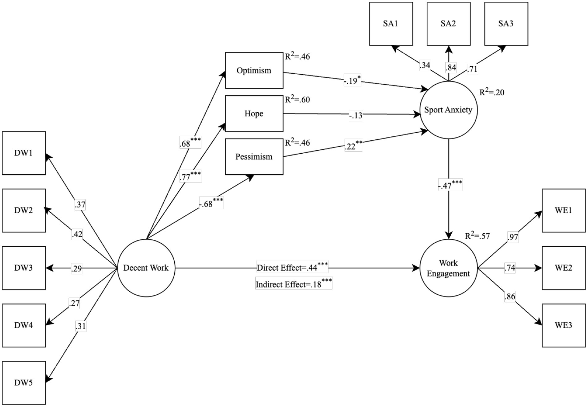 Results: The results revealed that decent work positively predicted hope, optimism, and work engagement, and negatively predicted pessimism. Optimism negatively predicted sport anxiety, while pessimism positively predicted it. Sport anxiety had a significant negative effect on work engagement. Furthermore, optimism, pessimism, and sport anxiety significantly mediated the relationship between decent work and work engagement in a serial manner. Hope did not significantly mediate this relationship.