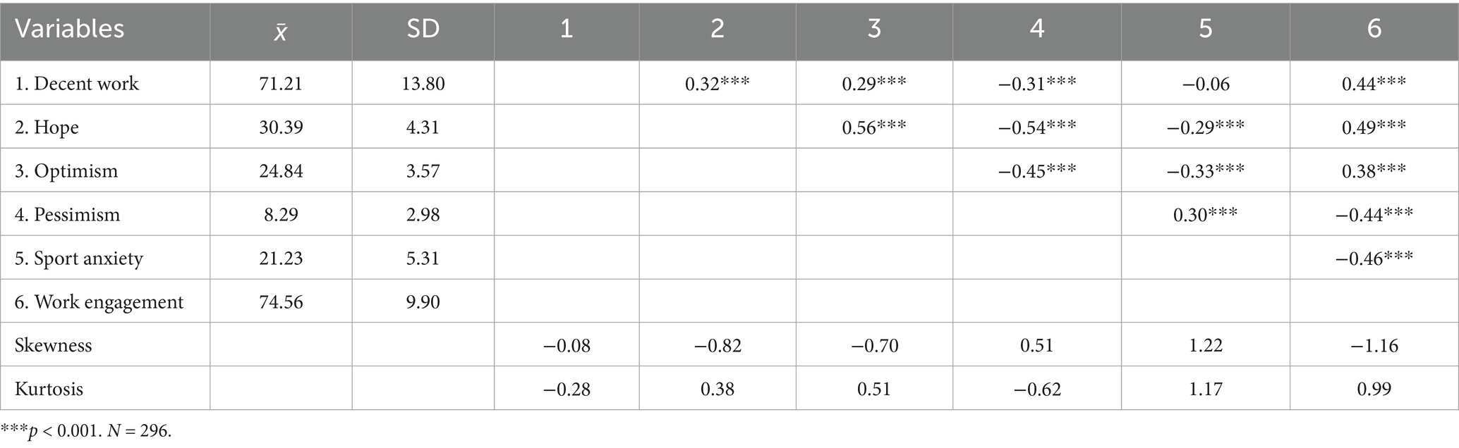 When Table 1 is examined, it is seen that there is a positive relationship between decent work and work engagement (r = 0.44, p < 0.001), hope (r = 0.32, p < 0.001) and optimism (r = 0.29, p < 0.001). On the other hand, while there is a negative relationship between decent work and pessimism (r = −0.31, p < 0.001), there is no significant relationship between sports anxiety. In addition, there are negative relationships between work engagement and sport anxiety (r = −0.46, p < 0.001) and pessimism (r = −0.44, p < 0.001). On the other hand, there are positive relationships between work engagement and optimism (r = 0.38, p < 0.001) and hope (r = 0.49, p < 0.001).
