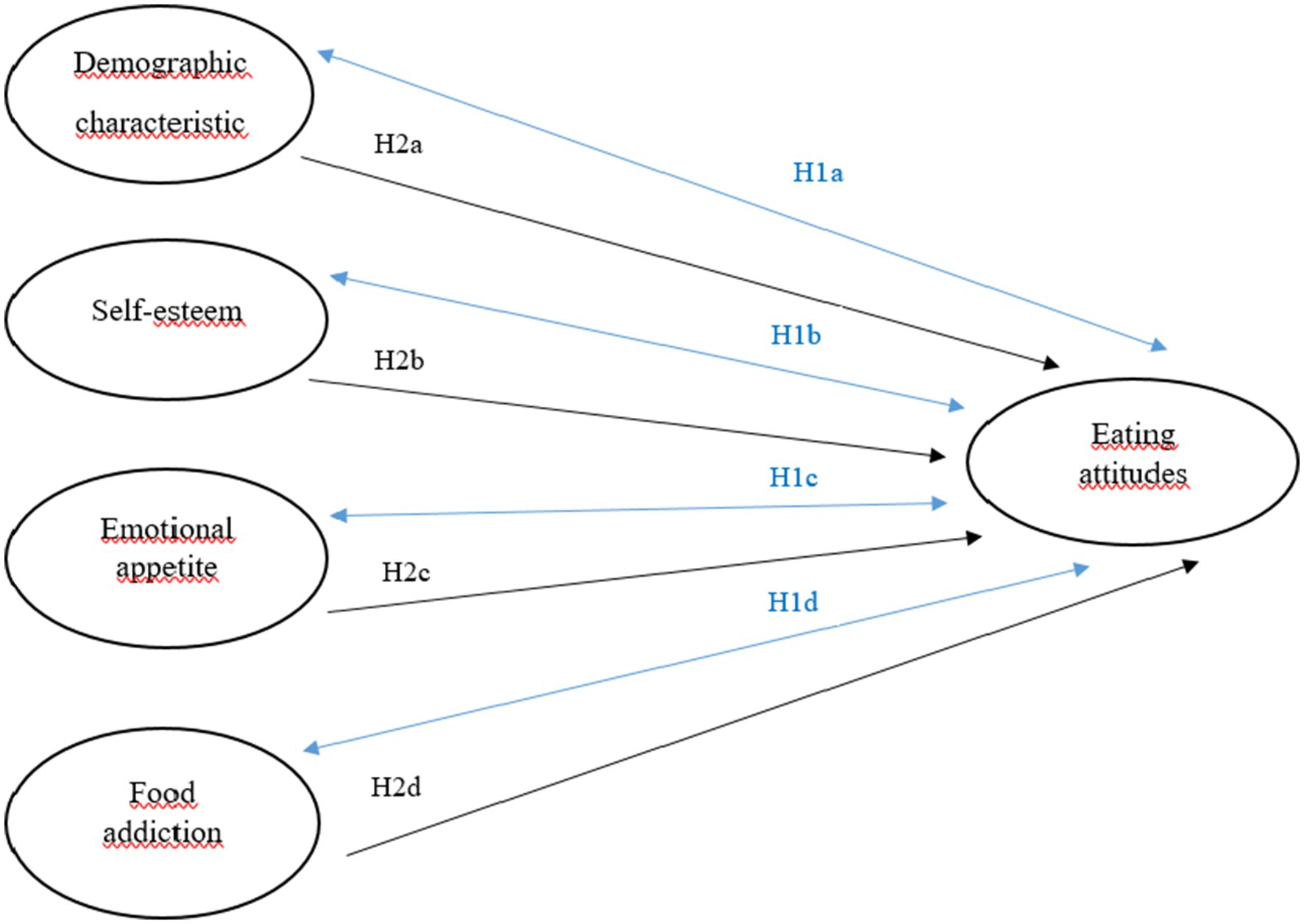 The relationship between eating behavior, emotional appetite, and food addiction is complex and multifaceted. Emotional appetite refers to eating in response to emotional cues rather than hunger. It is emphasized that individuals with a high tendency toward emotional eating are more likely to exhibit symptoms of food addiction (Borisenkov et al., 2020; Sanlier et al., 2017), and that emotional eating is positively associated with food addiction (Borisenkov et al., 2020). People experiencing stress and depression often resort to emotional eating, which can increase their risk of developing food addiction (Fernández et al., 2022). The positive and significant relationship among eating-related variables (eating styles, binge eating and bulimia) with food addiction was demonstrated (Escrivá-Martínez et al., 2023). Low self-esteem is linked to less healthy eating attitudes and a greater risk of food addiction (Sanlier et al., 2017).