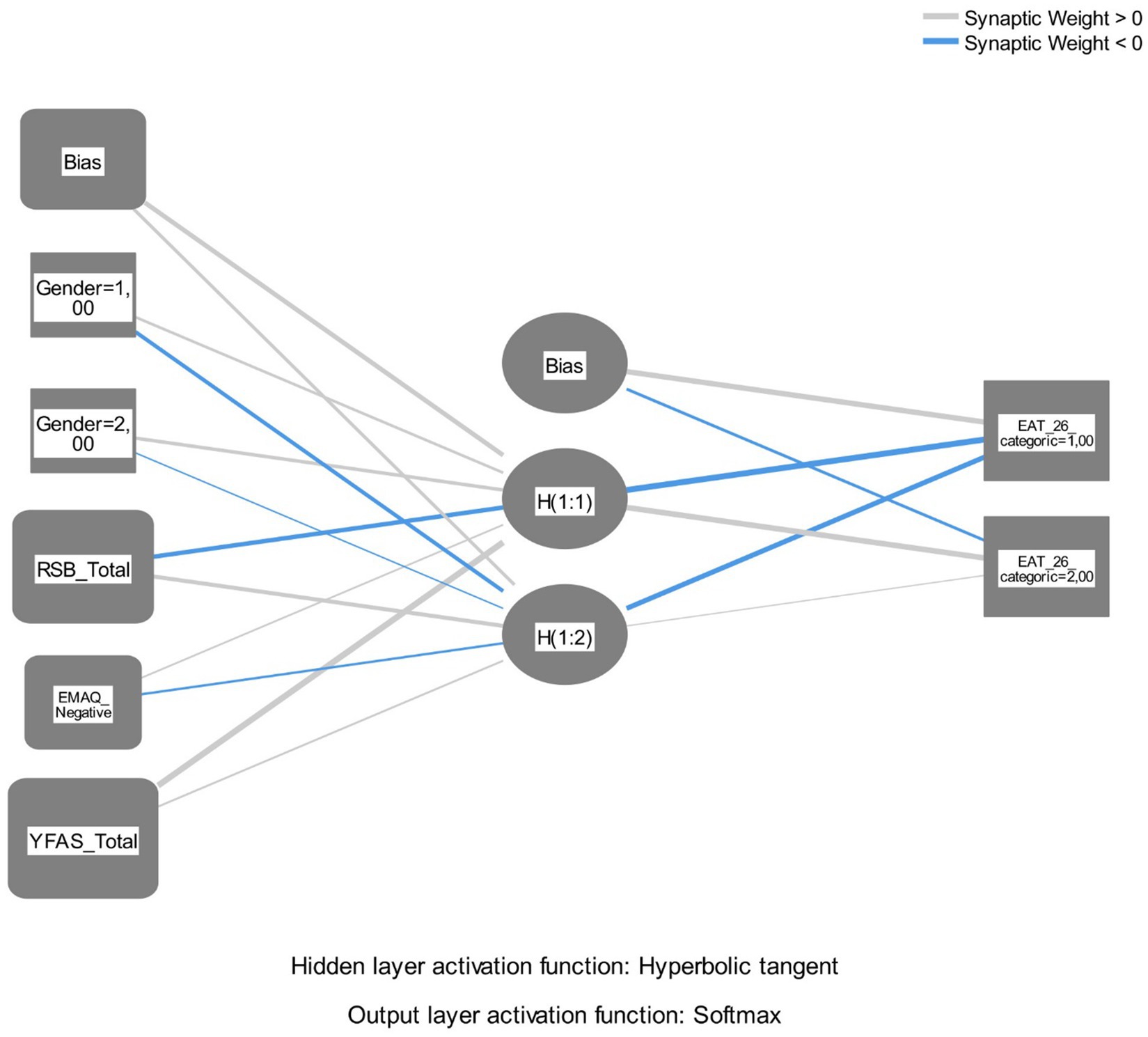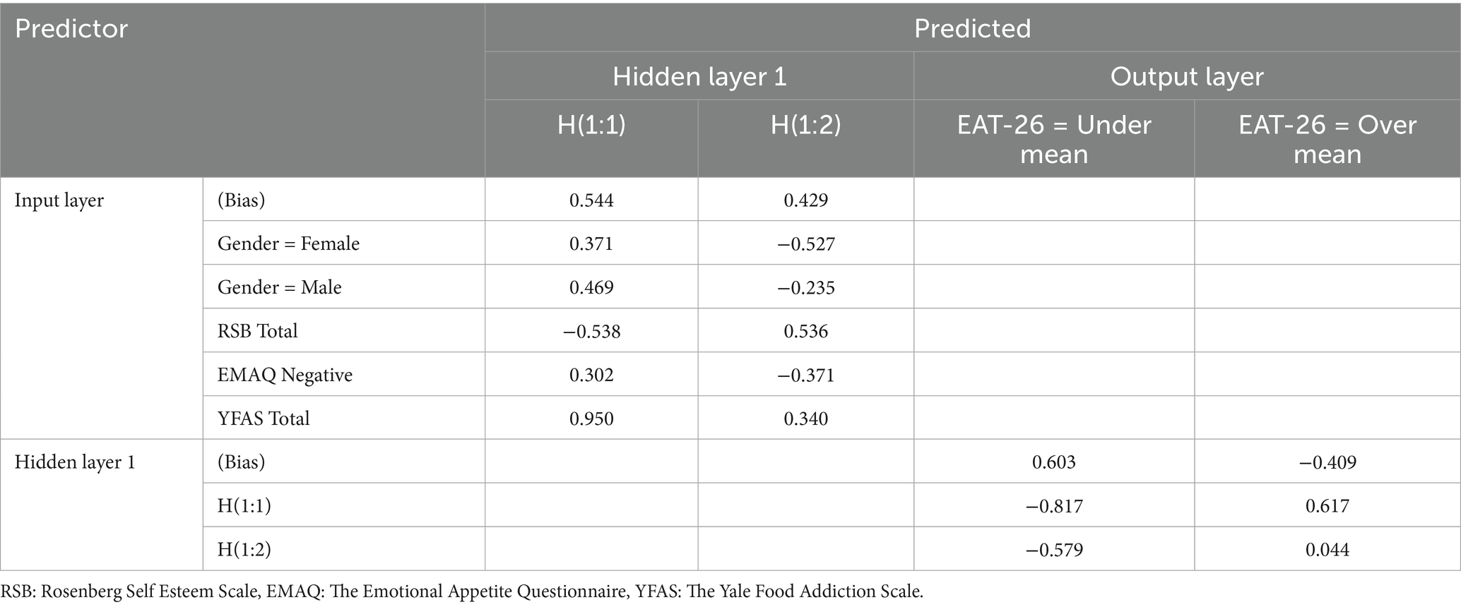 Hidden layer parameter values showed that YFAS had the highest value (0.950) followed by RSB (−0.538; absolute value) and EMAQ negative (0.302) in H(1:1) layer. In H(1:2) layer, RSB (0.536) had the highest value, followed by EMAQ negative (0.371; absolute value) and YFAS (0.340) (Table 6). According to the model summary output, the artificial neural network correctly classified 62.9% of the training data and 64.9% of the testing data, corresponding to incorrect prediction rates of 37.1 and 35.1%, respectively. These findings show that food addiction, self-esteem, and emotional eating are key predictors of disordered eating attitudes in the ANN model.