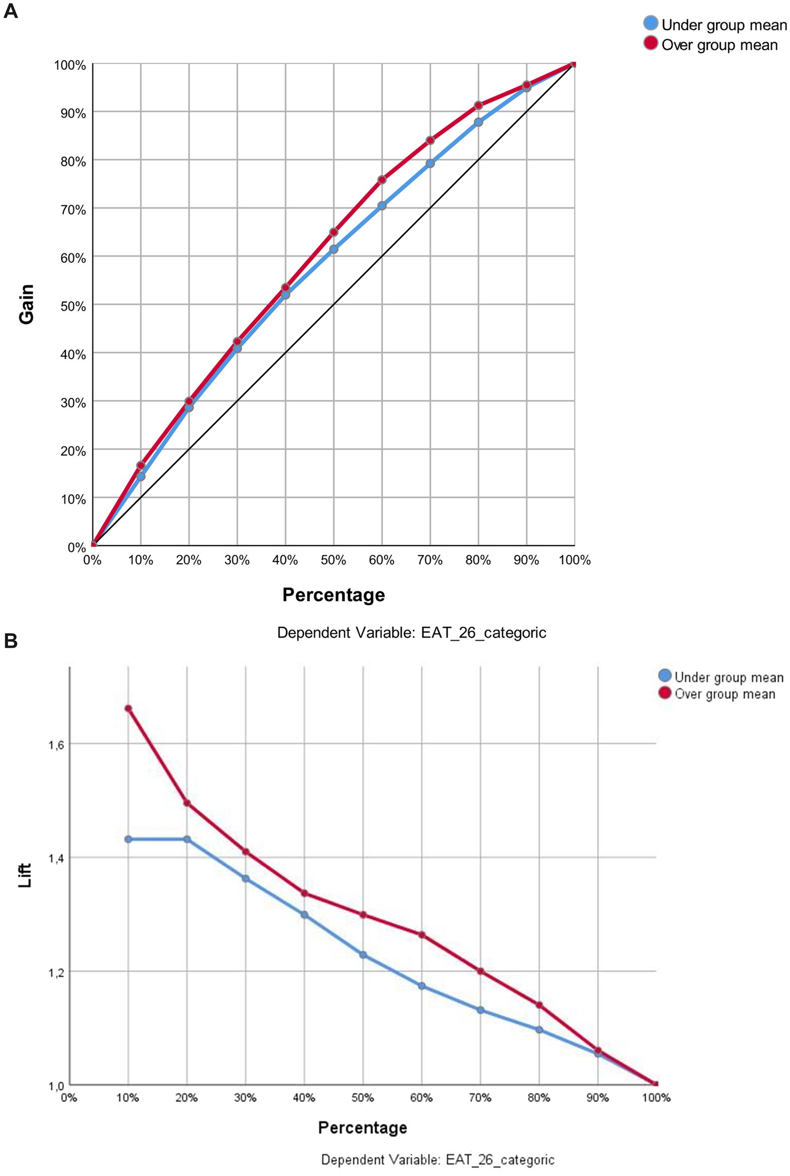 Figure 3. (A,B) Gain and lift charts for the classification performance of the model on eat-26 categories.