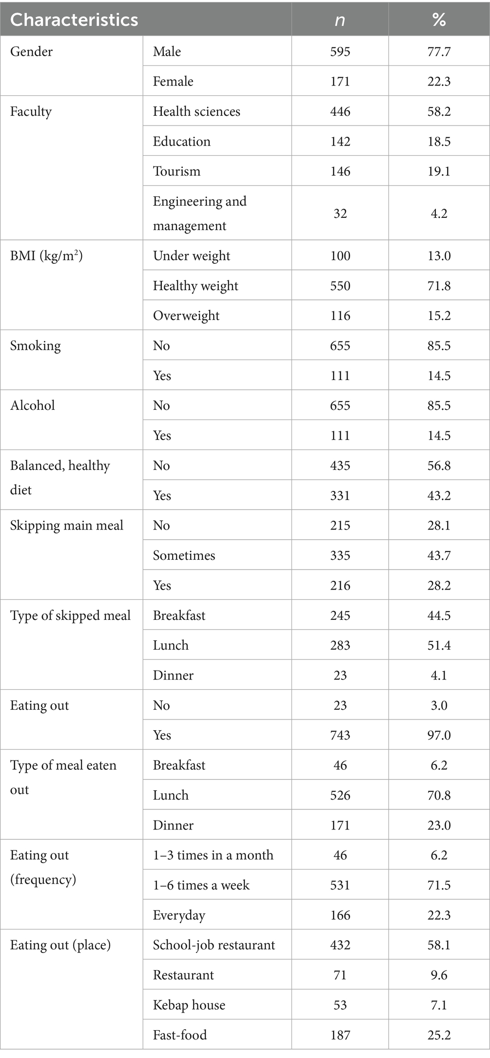 A total of 766 volunteers, including 171 females and 595 males, participated in this descriptive cross-sectional study. The majority of participants were male (77.7%). The highest rates participation was from the health sciences (58.2%) departments, followed by tourism (19.1%) department and education (18.5%) departments. In reaction to the BMI, 13.0% of the participants were underweight, 71.8% had a healthy weight, and 15.2% of the participants were overweight/obese. In addition, 14.5% of the participants were smoking and 14.5% were drinking alcohol. Within the whole sample, 43.2% of the participants thought that they have an adequate, balanced, healthy diet, and 97.0% of them stated that they eat out, and 57.4% of them eat at school or workplace restaurants, the majority skip breakfast or lunch, 71.5% eat out of home 1–6 times a week, and 58.1% eat at school-work restaurants (Table 1).