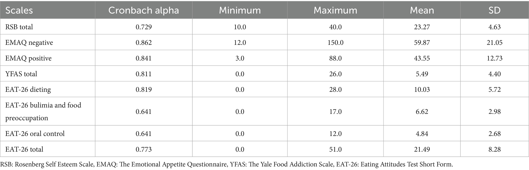 The internal consistency of the scales employed in the study was assessed using Cronbach’s alpha coefficient. High reliability levels were observed in the EMAQ negative (α = 0.862), EMAQ positive (α = 0.841), YFAS (α = 0.811), and EAT-26 Eating Obsession (α = 0.819) subscales. The reliability level for RSB (α = 0.729) and EAT-26 Total (α = 0.773) was found to be acceptable. The reliability level for the EAT-26 Restriction and Social Pressure subscales was moderate, with α = 0.641. Participants’ RSB scores ranged from 10.0 to 55.0, with a total score average of 23.2 ± 4.63. The EMAQ negative average was 59.8 ± 21.05, and the EMAQ positive average was 43.5 ± 12.73. The total YFAS average is 5.4 ± 4.40. EAT-26 total scores range from 0.0 to 51.0, with an average of 21.49 ± 8.28 (Table 2).