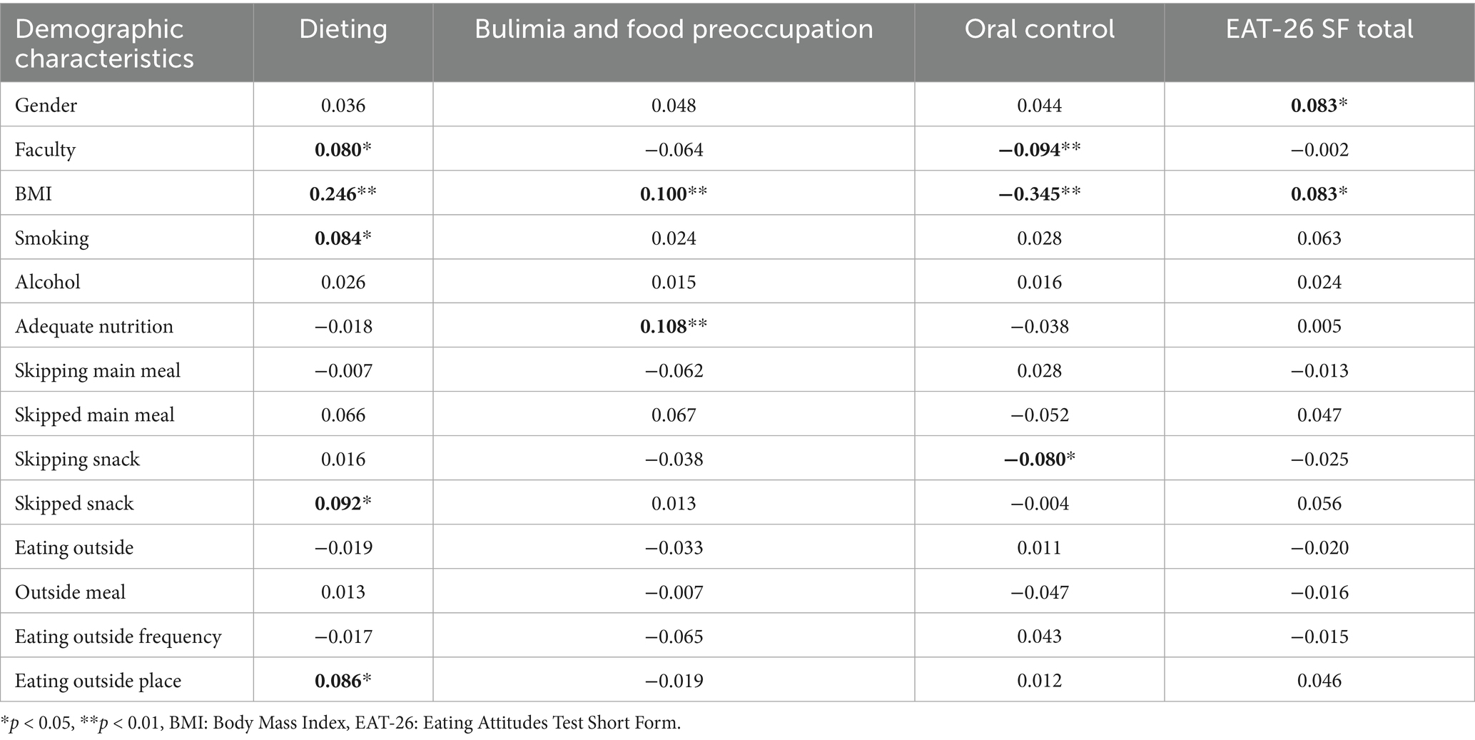 The preoccupation with eating sub-scale of EAT-26 was significantly correlated with the participants’ faculty (r = 0.080; p < 0.05), BMI (r = 0.246; p < 0.01), smoking (r = 0.084; p < 0.05), skipped snack (r = 0.092; p < 0.05), and eating out (place) (r = 0.086; p < 0.05). The restriction subscale of EAT-26 was significantly correlated with BMI (r = 0.100; p < 0.01) and adequate nutrition (r = 0.108; p < 0.01). The social pressure sub-scale of EAT-26 was significantly correlated with the participants’ faculty (r = −0.094; p < 0.01), BMI (r = −0.345; p < 0.01), and skipping snacks (r = −0.080; p < 0.01). EAT-26 total was significantly correlated with gender (r = 0.083; p < 0.05) and BMI (r = 0.083; p < 0.05) (Table 3).