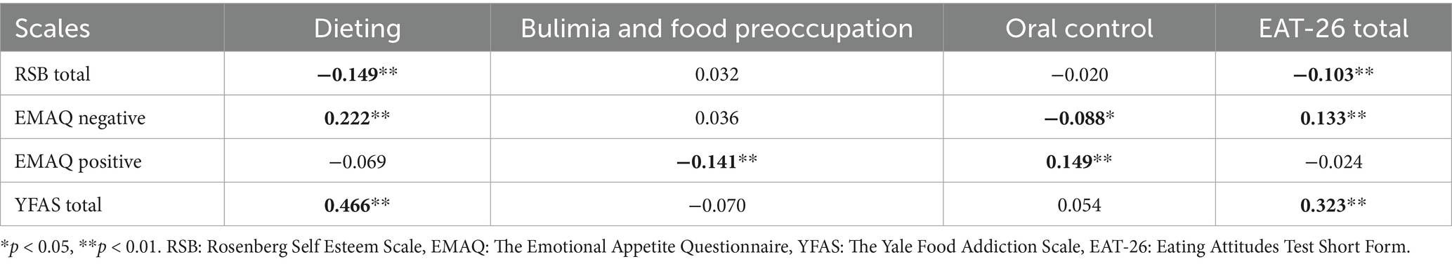 The eating concern subscale was negatively correlated with RSB, EMAQ negative and YFAS, while the restriction subscale was positively correlated with EMAQ positive, the social pressure subscale of EMAQ negative and EMAQ positive, the EAT-26 score was significantly associated with RSB, EMAQ negative, and YFAS (Table 4). A study has shown that EAT-26 is positively correlated with EMAQ negative scores, indicating that individuals at higher risk of eating disorders are more likely to engage in negative emotional eating behaviors (Barnhart et al., 2024). Emotional eating triggered by negative emotions seems to play a significant role in both the onset and persistence of disordered eating behaviors. Our findings indicate that emotional appetite influences both eating behaviors and food addiction. Previous research has also shown that eating behavior, shaped by physical, psychological, and social factors, impacts individuals’ dietary habits and overall health (Dugué et al., 2016; Alexatou et al., 2025). Adolescents with low self-esteem may use food as a coping mechanism, leading to disordered eating patterns (Sanlier et al., 2017). Studies have found that EAT-26 scores are particularly positively associated with food addiction and emotional eating in response to negative emotions (Cinelli et al., 2020; Sanlier et al., 2017; Sanlier et al., 2017). The YFAS has been reported to be positively correlated with EMAQ-negative scores, indicating that individuals with higher levels of food addiction are more likely to exhibit emotional eating behaviors in response to negative affect. This suggests that emotional eating plays a role in both the development and maintenance of food addiction (Burrows et al., 2018; Sanlier et al., 2017; Barnhart et al., 2024).