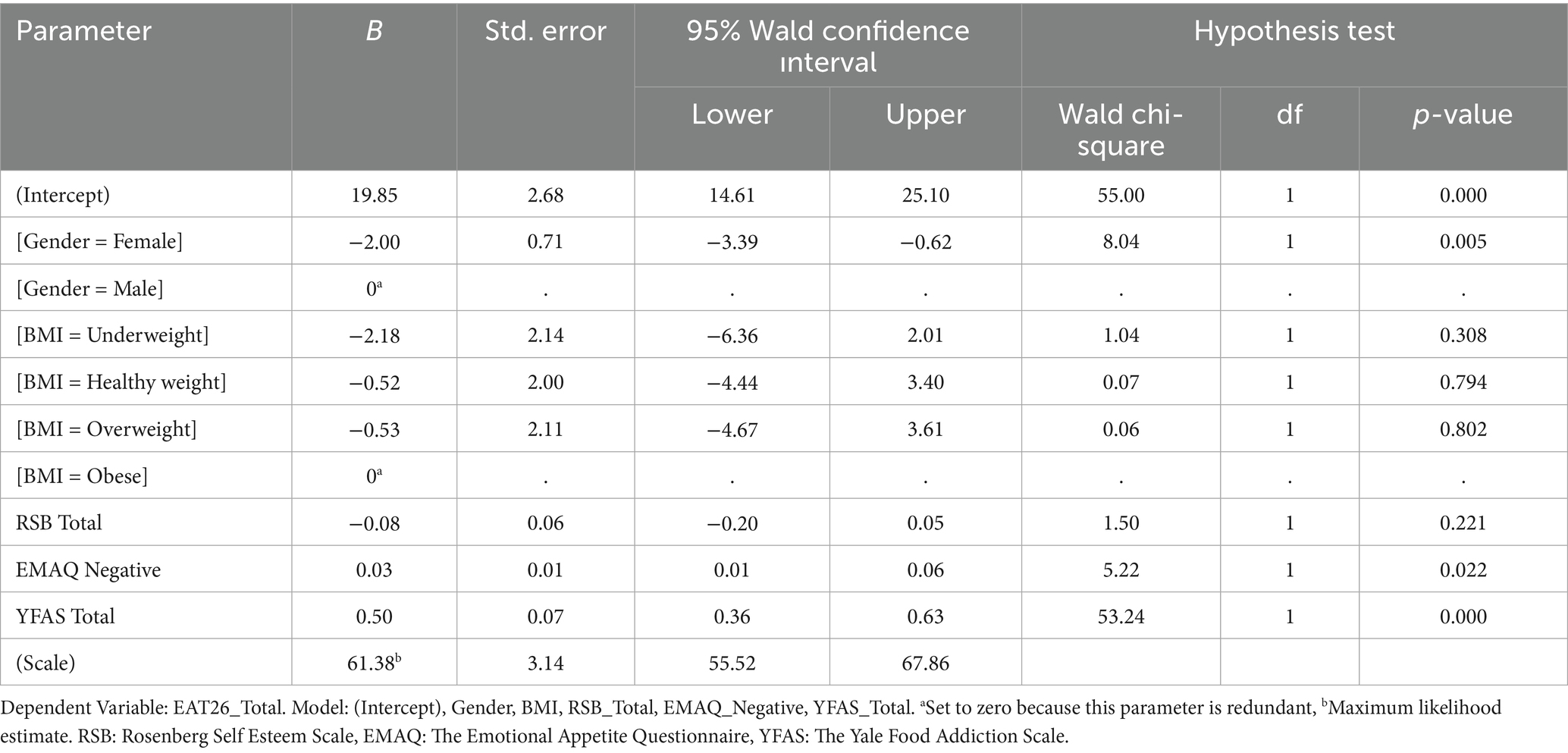 Generalized linear model at multivariable level showed that the effects of gender (B = −2.00), EMAQ negative (B = 0.03; p < 0.05), and YFAS total (B = 0.496; p < 0.01) on EAT-26 were statistically significant (Table 5).