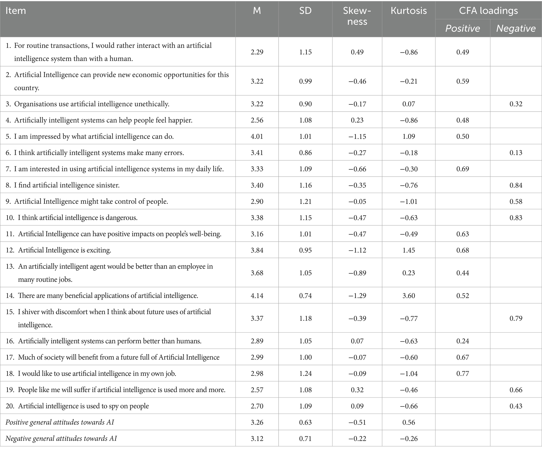 In our case, Items 3, 6, and 16 showed loadings below the recommended threshold (<0.40; see Table 1). Nevertheless, considering the sample size and the theoretical relevance of these items, we decided to retain them to maintain consistency with the original GAAIS structure and to preserve content validity. This approach is also in line with the original validation study (Schepman and Rodway, 2023), where similar item-level issues (e.g., Item 6) were observed and no exclusions were made. The implications of potential item removal will be further examined in a forthcoming cross-cultural investigation including data from multiple countries.