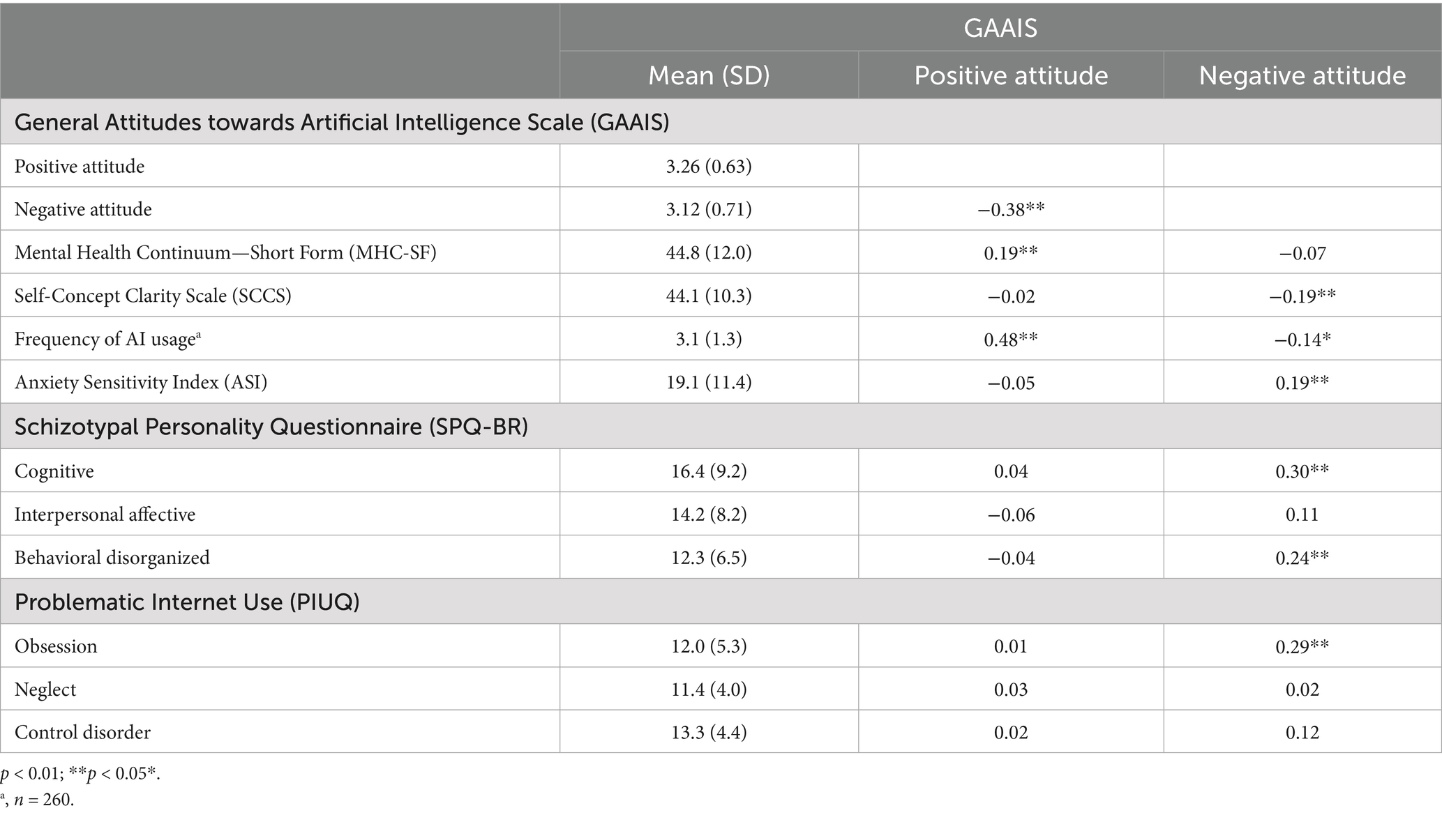 Correlation analysis (Table 2) revealed a strong inverse relationship between positive and negative attitudes, as measured by the GAAIS. Specifically, individuals exhibiting a highly positive attitude toward AI tend to show a markedly low negative attitude and vice versa. Further analysis indicated that a positive attitude toward AI was positively associated with good mental health and frequent usage of AI. However, the negative AI-related attitude is associated with lower self-concept clarity, lower AI usage frequency scores, and higher anxiety, schizotypal cognitive disorder, behavioral disorganization, and high scores in obsessions related to problematic internet use.