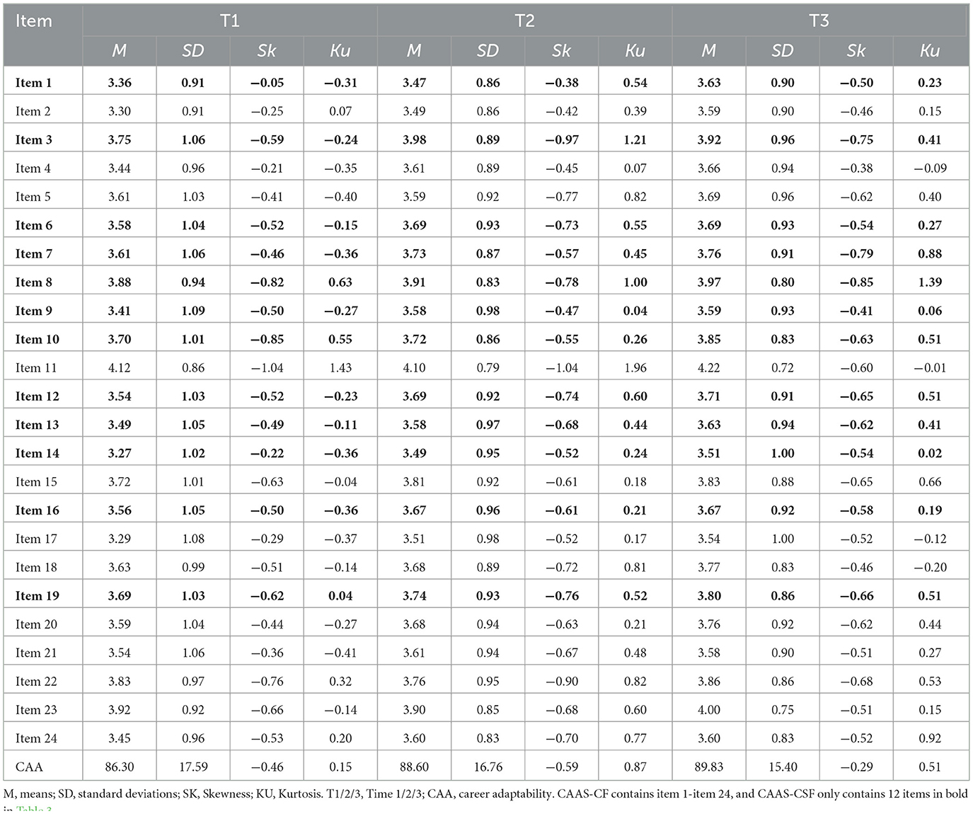 This study was the first to confirm the longitudinal factorial invariance of CAAS-CSF among college students and found that CAAS-CSF achieved strong longitudinal factorial invariance over a 12-month interval, indicating that that this tool can measure changes in time for the same attribute. Therefore, based on these results, it can be inferred that CAAS-CSF is an appropriate tool for longitudinal mean comparisons of career adaptability of Chinese college students. It is worth noting that this study tested factorial invariance of the CAAS-CSF based on three time points of college student sample data spanning 1 year. Further exploration is needed to determine whether the CAAS-CSF has longitudinal factorial invariance over longer periods of time or in other populations. Although the construct validity of the different versions of the CAAS was validated across countries, using techniques from CFA or MCFA, focused on measurement invariance analyses across groups, no longitudinal invariance analyses were conducted. Moreover, it has not been found that researchers have verified CAAS-CSF (12 items) based on Chinese Mainland samples. Therefore, this study takes College Students in Chinese Mainland as samples and conducts a psychometric analysis of the CAAS-CSF across groups and time points based on a longitudinal study. The results of this study will help more researchers choose the CAAS-CSF as a measurement tool for career adaptability, and gain a deeper understanding of the development and changes of college students' career adaptability.