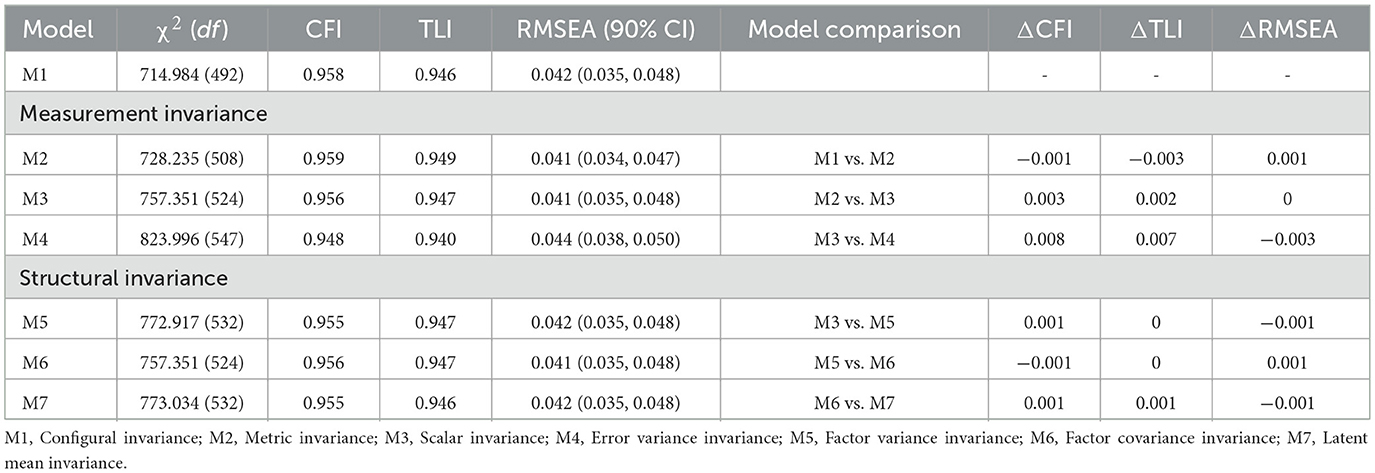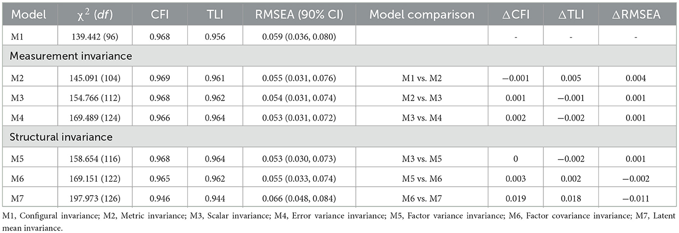 Factorial invariance refers to the consistency of the factor structure of a scale or testing tool when measuring the same latent variable in different populations or conditions, which requires that the factor loadings of the observed variable on the latent variable and the relationships between factors remain unchanged across different populations (Meredith, 1993; South et al., 2009). Configural, measurement, and structural invariance are collectively termed factorial invariance (Grugan et al., 2024; Lau and Yuen, 2015). Configural invariance is generally used as the baseline model for testing factorial invariance across groups or time points. The hierarchy of measurement invariance includes metric invariance, scalar invariance, and strict invariance error variance invariance. Structural invariance encompasses factor variance invariance, factor covariance invariance, and latent mean invariance.