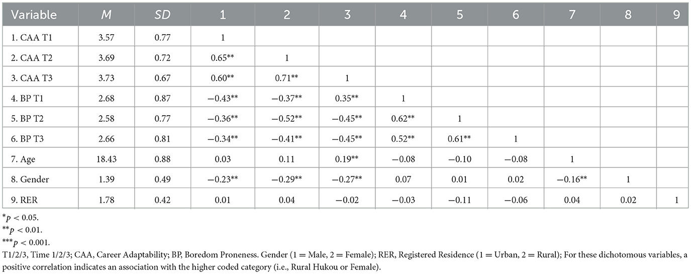 To assess potential bias associated with missing data, a series of t-tests and chi-square tests were conducted according to best practices for identifying sources of missing data (Nicholson et al., 2017). The analysis results showed that there were no significant differences in age (t = −1.22, p = 0.22), registered residence (χ2 = 1.01, p = 0.31), career adaptability (t = –0.37, p = 0.72), and boredom proneness (t = 0.42, p = 0.68) between the loss and invalid response subjects and the 259 subjects who completed all three surveys, except for gender (χ2 = 24.62, df = 1, p = 0.00). The loss rate for males is higher than for females. To further test the role of gender, the study examined the gender differences in career adaptability and boredom tendency at three time points. At all three time points, there were no gender differences in boredom proneness (t = −1.07, p = 0.28; t = −0.20, p = 0.85; t = −0.25, p = 0.80), however, males ‘career adaptability was higher than females' at all three time points (t = 3.74, p = 0.00; t = 4.76, p = 0.00; t = 4.50, p = 0.00). Therefore, although the loss rate for males is higher than for females, the direction of gender effects on the study variables at different time points is consistent, suggesting that the missing gender differences did not have a substantial impact on the study variables. Subsequent statistical analyses will control for gender effects, to ensure the validity of the final sample.