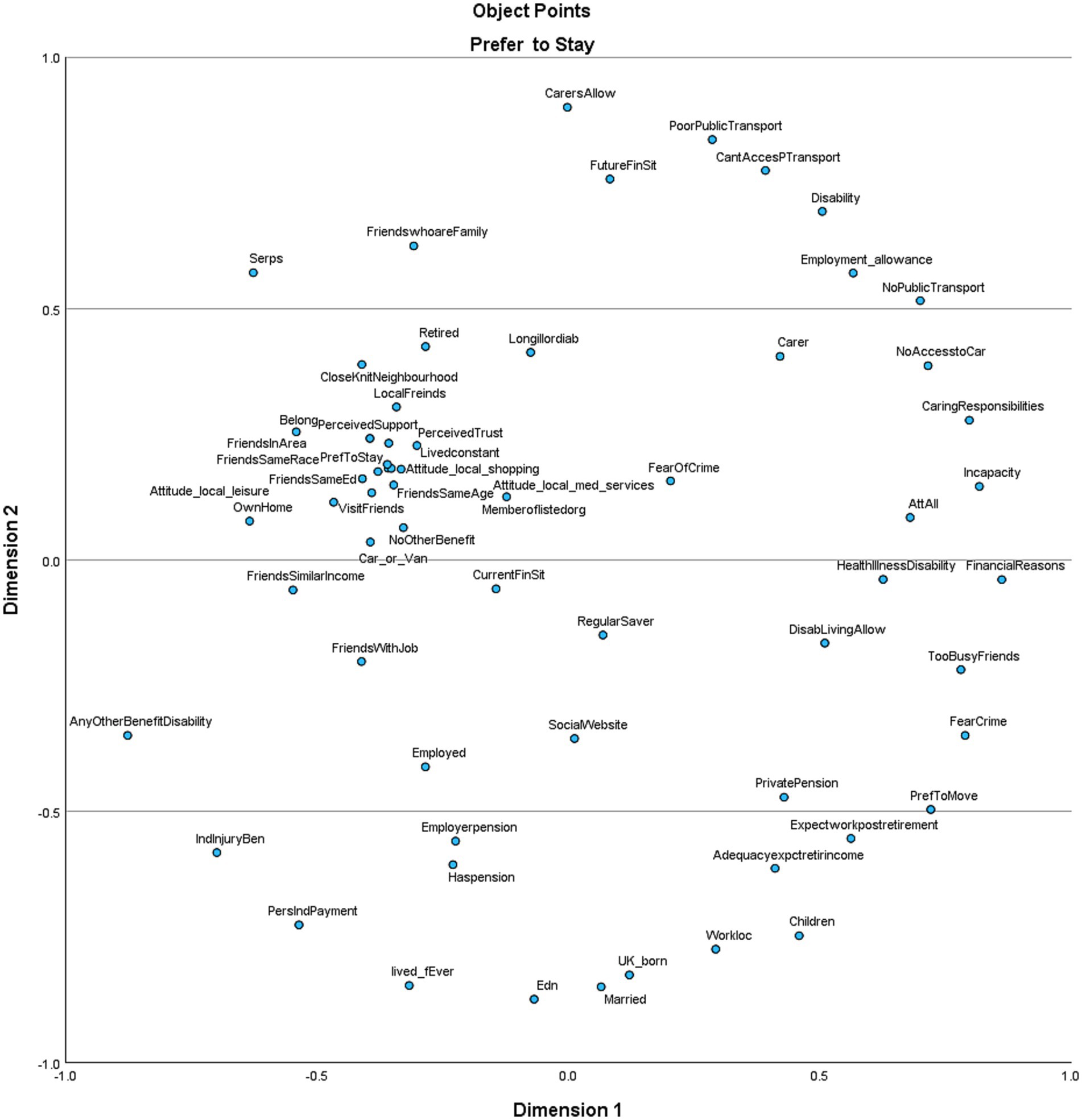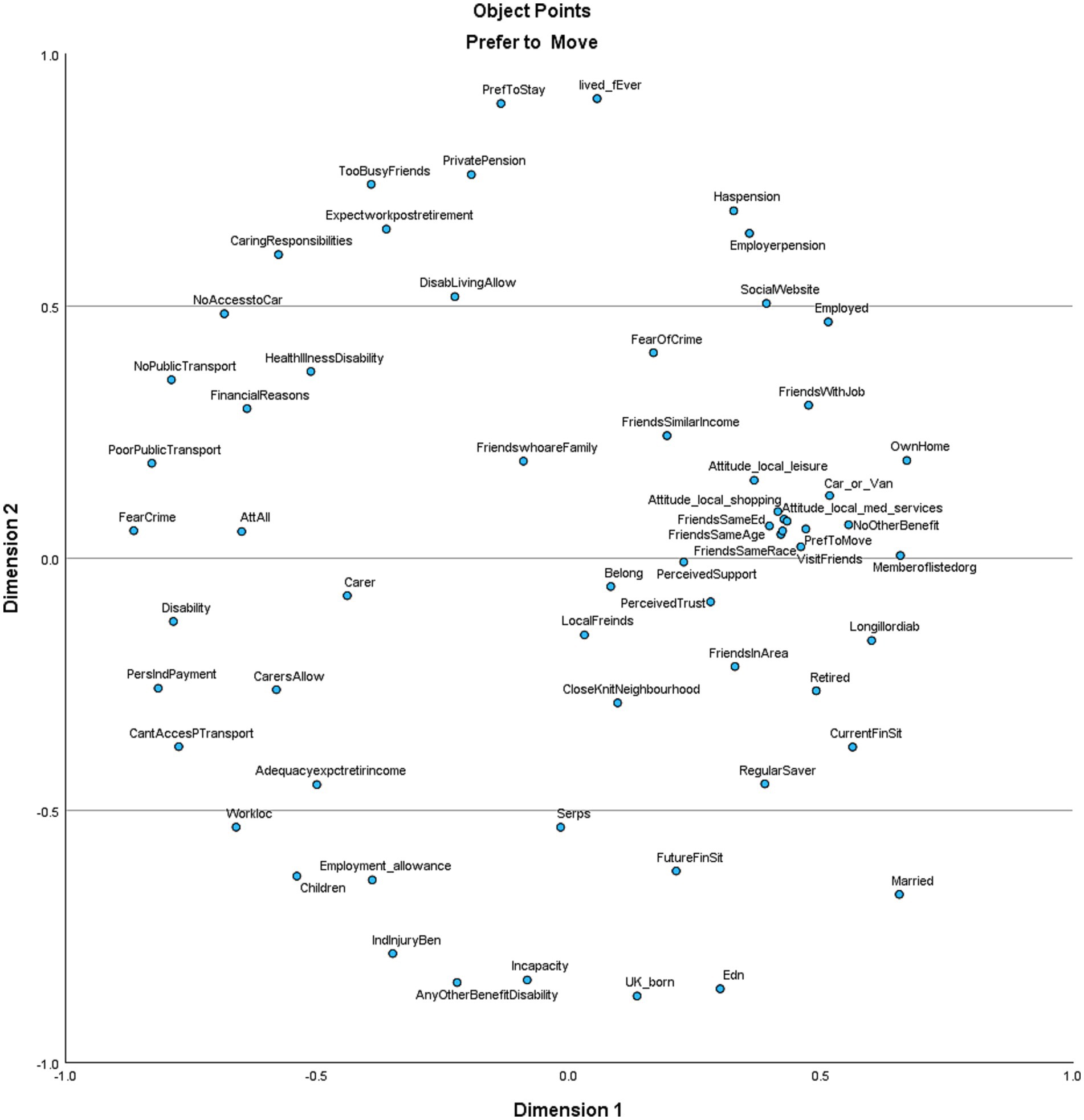 In this context, the purpose of the MDS analysis was to identify variables in the physical, social, or economic environment of the home or neighborhood that subsequent studies should investigate. The analytic process followed an iterative process. This began with a consideration of 306 variables in a data set that included 45,433 individual cases. Of these variables, on the basis of the author’s judgement, 62 were suitable for coherent dichotomization. For these, the authors calculated the Jaccard’s coefficient, which is a measure of association without which SSA cannot proceed. Next, based on respondents who preferred to stay in their current residence (n = 28,671) (vs. move, 12,679), the data were split into two files. This included removal of other data (e.g., “do not know”). Following initial reviewer feedback, no variables were removed on the basis of occurrence frequency. SPSS (Proxscal) was then used to calculate proximities between variables and present these in a two-dimensional space.