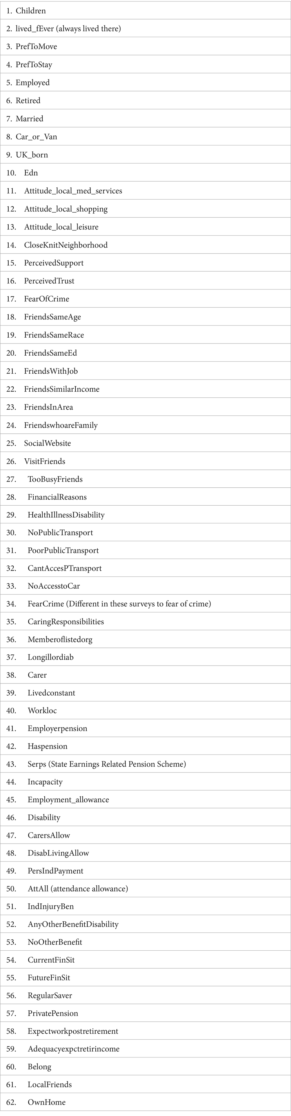Social relations and networks [Has pension / No Disability Benefit / No Other Benefit / Employer pension / Current Financial Situation / Attitude local leisure facilities]; Social and physical neighborhood resources [Friends Similar Income / Friends With Job / Friends In Area / Friends who are Family / Social Website / Visit Friends / Member of listed org / Local Friends]; and identification with the place [Fear Of Crime / Close Knit Neighborhood / Perceived Support / Perceived Trust / Feeling of belonging].