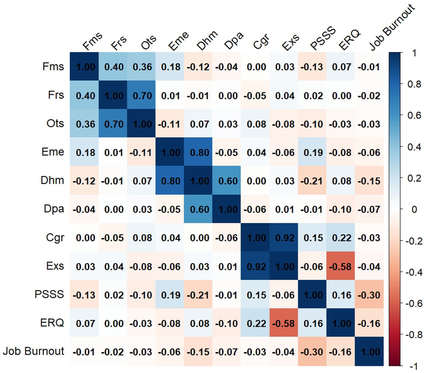 Figure 1. Partial correlation coefficients between different nodes. Fms, family support; Frs, friends support; Ots, other support; Eme, emotion exhaustion; Dhm, dehumanization; Dpa, diminished personal accomplishment; Cgr, cognitive reappraisal; Exs, expression suppression; PSSS, perceived social support; ERQ, emotion regulation questionnaire.