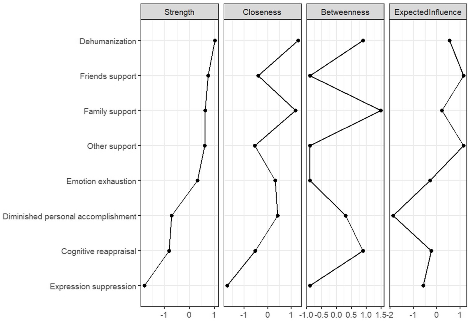 Figure 3 and Supplementary Table S2 shows the data values of each network node in terms of strength, proximity, mediation and expected impact. In the perceived social support network, the node representing family support demonstrated higher betweenness centrality and closeness centrality compared to other nodes, which indicates that it is more strongly connected to the other nodes in the network and that many of the shortest paths between nodes feed through it. In the network of nodes for job burnout, the depersonalization node shows stronger proximity and expected impact. In the emotion regulation network, the cognitive reappraisal node exhibited higher values than the expression suppression node across all centrality measures.