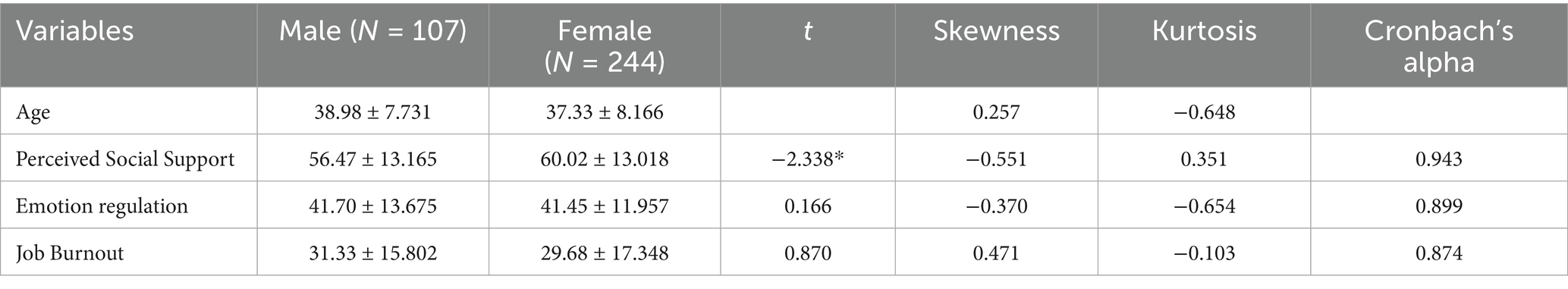 The study adopted a cross-sectional design and collected data from teachers in two public primary and secondary schools in Handan City, Hebei Province from May to July 2025, and conducted all procedures in compliance with the Declaration of Helsinki — Ethical Principles for Medical Research Involving Human Subjects, along with other applicable laws, regulations, and ethical guidelines. Prior to the survey, all participants received formal training to ensure the integrity of the study. The STROBE checklist for cross-sectional studies was followed and a questionnaire containing basic information about the subjects, perceived social support, emotion regulation and Job Burnout was created. After confirming the consent of the teachers, a link was given to them for completion.386 participants completed the questionnaire, to ensure data quality, each questionnaire was carefully reviewed after collection, and those that were incomplete, exhibited irregular patterns, or contained illogical responses were excluded, a total of 35 questionnaires were excluded, giving a validity rate of 90.93%. There were 107 (30.5%) male teachers and 244 (69.5%) female teachers; A total of 75 teachers were unmarried and had no children (21.4%), 52 were married but had no children (14.8%), and 224 were married and had children (63.8%); 178 (50.71%) elementary school teachers and 173 (49.29%) secondary school teachers, A total of 69 teachers had less than 3 years of work experience (19.6%), 88 had 3–5 years of experience (25.1%), and 74 had 5–10 years of experience (21.1%), with more than 10 years of employment 120 (34.2%), and the average age of the participants was 37.83 ± 8.061 years.
