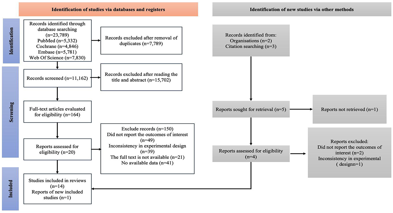 In the initial search, a comprehensive retrieval of four electronic databases was conducted from January 1, 2000, to June 5, 2025, and a total of 23,789 articles were identified. After removing duplicate studies (n = 7,789), 16,000 relevant articles remained. Subsequently, through screening of titles and abstracts, 15,702 articles were excluded, and finally, 164 articles advanced to the full-text review stage. At this stage, the scoring consistency between the two evaluators was rated as “good” (Cohen's kappa = 0.73). After the full text review, 149 articles were further excluded. Specifically, 49 articles did not report results, 39 had inconsistent experimental designs, 21 were unavailable in full text, and 40 had no available data. Therefore, a total of 15 studies were selected in the initial search (Figure 1). At this stage, the inter-rater reliability between the two assessors was classified as “excellent” (Cohen's kappa = 0.84).