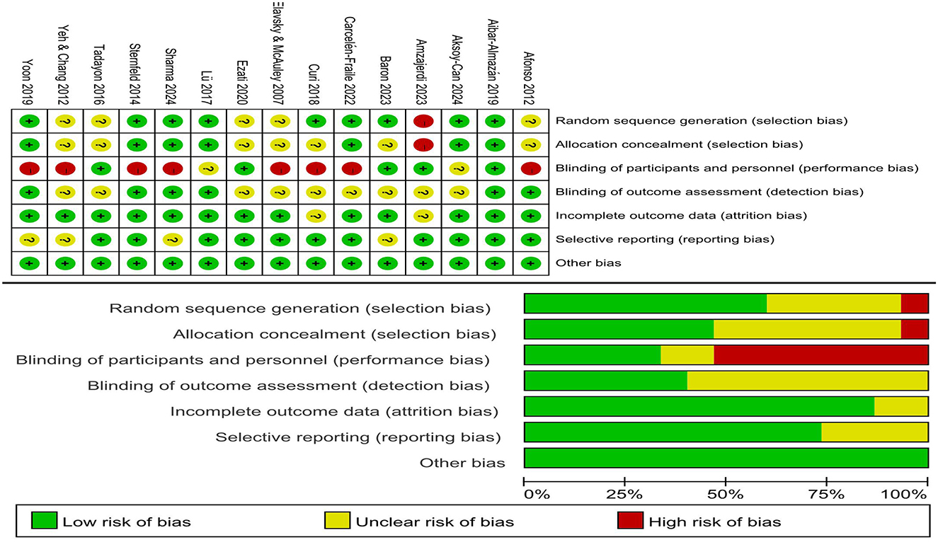 Among the 15 studies, for random sequence generation, approximately 9 studies were deemed to have a low risk of bias, 5 had an unclear risk, and 1 had a high risk. For allocation concealment, around 7 studies were considered to have a low risk of bias, 7 had an unclear risk, and 1 had a high risk. Regarding blinding of participants and personnel, 5 studies were judged to have a low risk of bias, 2 had an unclear risk, and 8 had a high risk. For blinding of outcome assessment, 6 studies were considered to have a low risk of bias, and 9 had an unclear risk. For incomplete outcome data, 14 studies were deemed to have a low risk of bias, and 1 had an unclear risk. For selective reporting, 11 studies were considered to have a low risk of bias, and 4 had an unclear risk. All 15 studies were classified as having a low risk of other bias. The specific bias assessment results are presented in Figure 2, which detail the scores and classifications of each study according to each bias risk criterion.