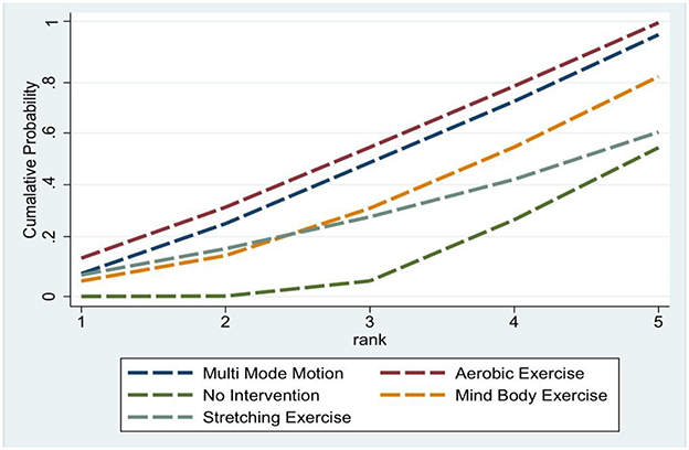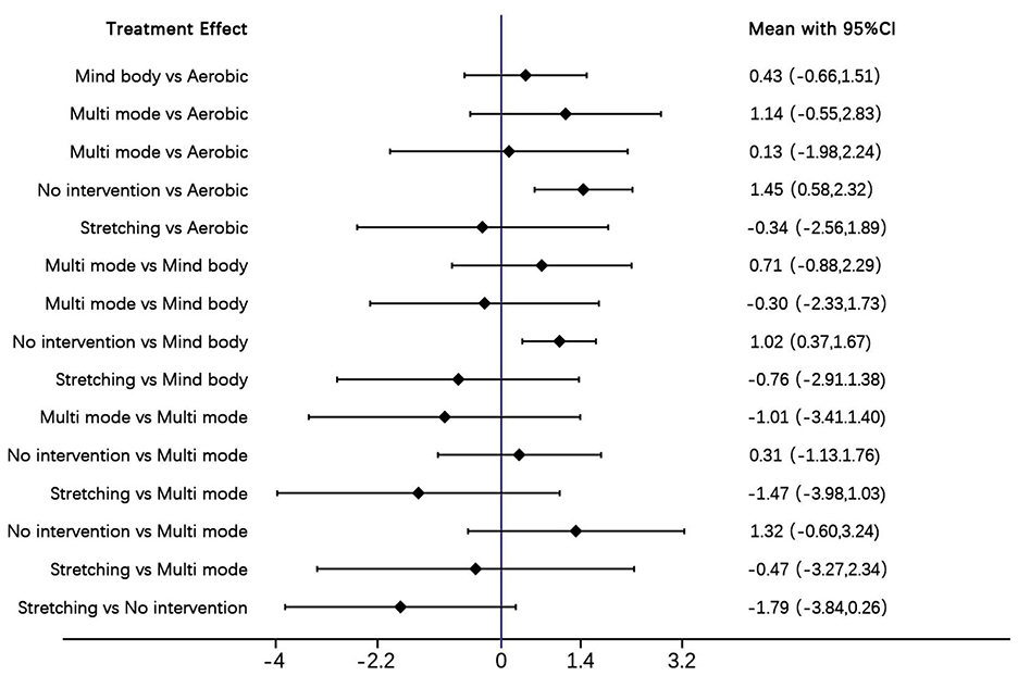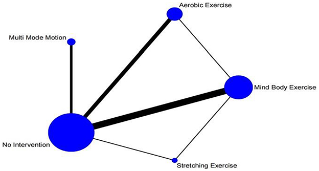 Figure 3 The network meta-analysis graph is presented. Apparently, among the experimental group, the three intervention measures with the largest sample sizes are aerobic exercise, multi mode motion, and Mind body exercise. In the control group, the intervention with the largest sample size is no intervention, which means maintaining daily activities. The most frequently studied comparisons are between aerobic exercise and maintaining daily activities, as well as between Mind body exercise and maintaining daily activities.