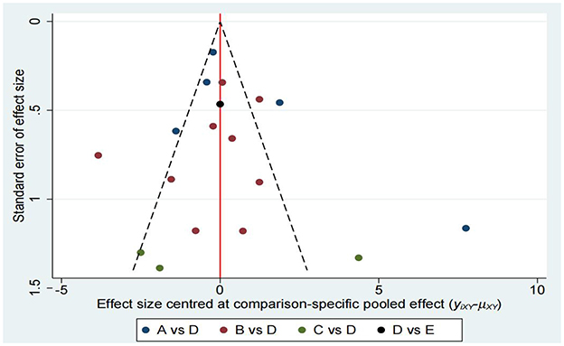 For continuous outcomes, we calculated the standardized mean difference (SMD) and its 95% confidence intervals (CIs). For statistical heterogeneity, we used the chi-square test P-value and I2 statistic (I2 > 50% = moderate heterogeneity; I2 > 75% = high heterogeneity). To resolve scale heterogeneity (e.g., varied measurement tools, intervention protocols), we applied an inverse variance-weighted random-effects model (accounting for between-study variability via τ2 estimation) to maintain methodological parsimony and comparative consistency. Per PRISMA-NMA guidelines, we prioritized a frequentist over Bayesian framework to improve interpretability and avoid Markov chain Monte Carlo convergence complexities. The analytical workflow included three core steps: (1) generating evidence network plots via Stata 15.1′s “network” package (node size = study sample size; line thickness = number of trials per comparison); (2) synthesizing effect sizes using maximum likelihood estimation in multivariate meta-regression (integrating direct/indirect evidence); (3) validating consistency via node-splitting tests (p > 0.05 = statistically consistent). For network meta-analysis, we used the “network” package to generate evidence network plots (as above). We calculated SUCRA (percentage values; higher = more effective) to rank intervention effectiveness, with results presented in a probability table. Potential publication bias was assessed via funnel plots, with adjustments for its potential impact on results.