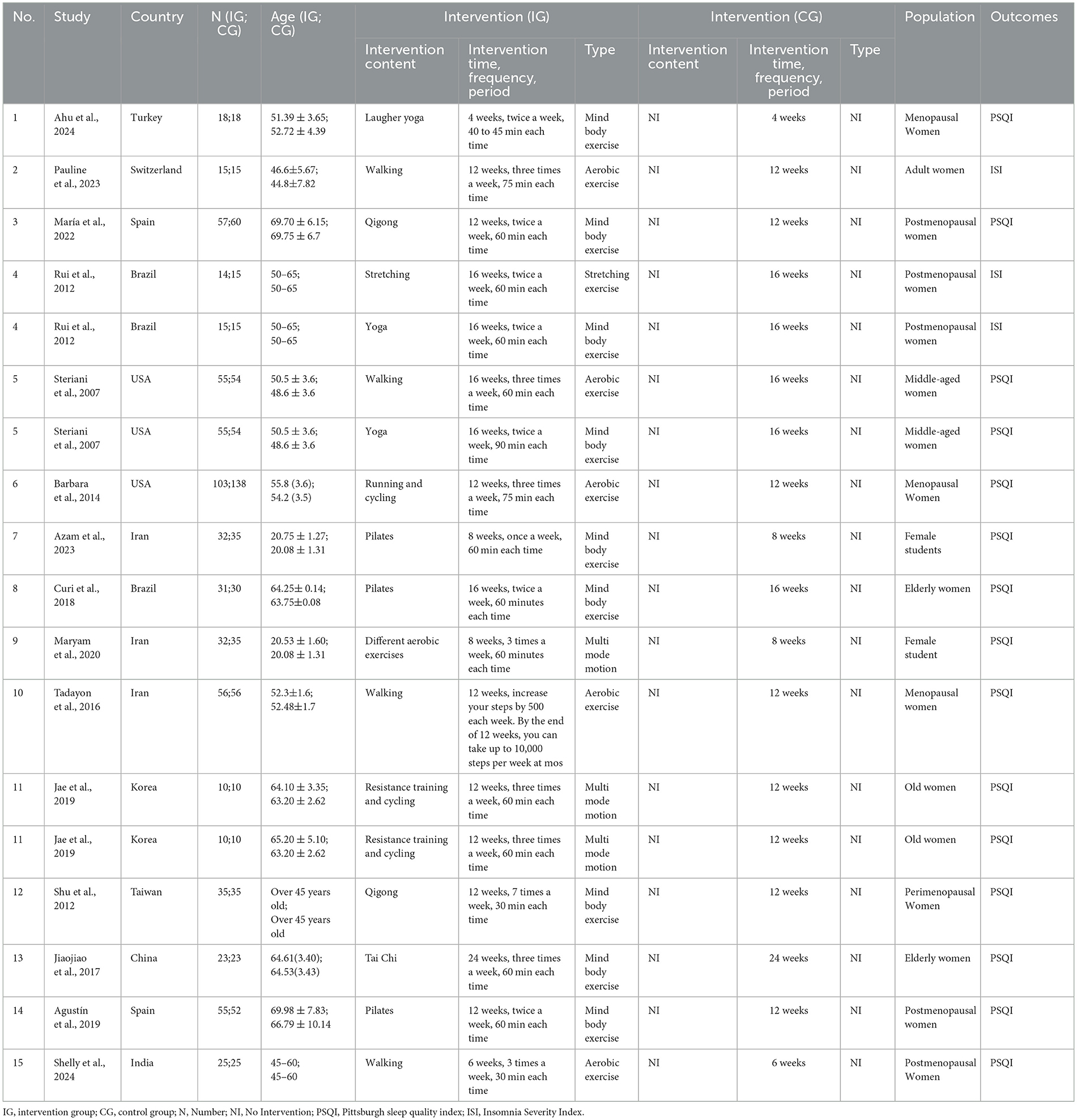 Results: Fifteen RCTs were finally included in the meta—analysis for synthesis. The results showed that, in terms of the effect on sleep quality in women, aerobic exercise exhibited superior efficacy with a SUCRA value of 77.2%, followed by Multi mode motion with a SUCRA value of 70.5%. Mind body exercise and stretching exercise also showed improvements to a certain extent, with SUCRA values of 57.1% and 38.8%, respectively.
