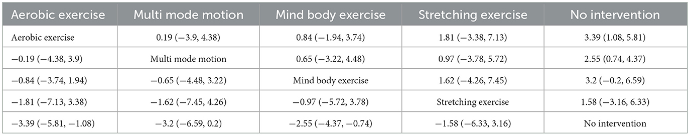 The following results report the effect size magnitudes (SMD with 95% CIs) for comparisons between different exercise interventions. Aerobic exercise showed greater improvement compared to no intervention (SMD = 3.39 [95% CI: 1.08, 5.81]); this effect translated to clinically meaningful sleep improvement, as it can help most women with poor sleep quality (per PSQI criteria) transition to good sleep and alleviate insomnia related symptoms significantly and stretching exercise (SMD = 1.81 [95% CI: −3.38, 7.13]), as well as an advantage over Mind body exercise (SMD = 0.84 [95% CI: −1.94, 3.74]) and multi mode motion (SMD = 0.19 [95% CI: −3.90, 4.38]). Mind body exercise is more effective than no intervention (SMD = 2.55 [95% CI: 0.74, 4.37]) it exerts tangible clinical benefits, such as reducing sleep disruptions linked to hormonal fluctuations (e.g., in perimenopausal women) and relieving mild to moderate insomnia symptoms but shows no clear advantage over aerobic exercise (SMD = −0.84 [95% CI: −3.74, 1.94]), multi–mode motion (SMD = −0.65 [95% CI: −4.48, 3.22]), or stretching exercise (SMD = 0.97 [95% CI: −3.78, 5.72]). Multi mode motion demonstrates improvement compared to no intervention (SMD = 3.20 [95% CI: −0.20, 6.59]) and stretching exercise (SMD = 1.62 [95% CI: −4.26, 7.45]) its clinical value lies in addressing both physical discomfort (e.g., muscle stiffness) and psychological stress that disrupt sleep, making it suitable for subgroups like elderly women but does not significantly differ from aerobic exercise (SMD = −0.19 [95% CI: −4.38, 3.90]) or Mind body exercise (SMD = 0.65 [95% CI: −3.22, 4.48]). No intervention is consistently less effective, performing worse than aerobic exercise (SMD = −3.39 [95% CI: −5.81, −1.08]) and Mind body exercise (SMD = −2.55 [95% CI: −4.37, −0.74]), and showing no advantage over multi mode motion (SMD = −3.20 [95% CI: −6.59, 0.20]) or stretching exercise (SMD = −1.58 [95% CI: −6.33, 3.16]). Stretching exercise has no significant advantage compared to aerobic (SMD = −1.81 [95% CI: −7.13, 3.38]), mind–body (SMD = −0.97 [95% CI: −5.72, 3.78]), or multi mode motion (SMD = −1.62 [95% CI: −7.45, 4.26]), but is superior to no intervention (SMD = 1.58 [95% CI: −3.16, 6.33]) its clinical effect is limited, though, as it only slightly improves sleep initiation and has little impact on key sleep indicators like sleep duration and efficiency (Table 2).