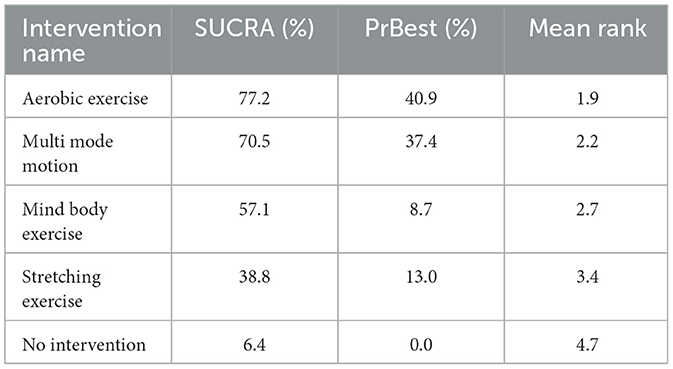 This network meta-analysis comprehensively evaluated the effects of various physical activity interventions on women's sleep. Based on a comprehensive analysis of 15 RCTs, our findings indicate that aerobic exercise, multi mode motion, and Mind body exercise are the most effective non-pharmacological interventions for improving women's sleep. Notably, aerobic exercise is the intervention most likely to achieve optimal outcomes (SUCRA = 77.2%), followed closely by multi mode motion (SUCRA = 70.5), which reflects its synergistic potential in improving women's sleep. Mind body exercise ranks third (SUCRA = 57.1%) (Table 3).