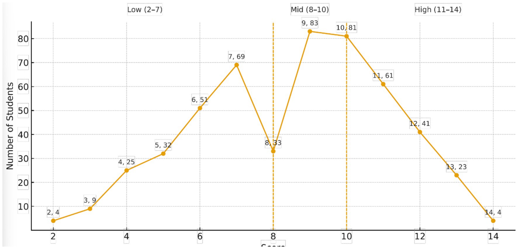 Prior to full scoring, we calibrated against the CET-4 rubric: two raters independently and blindly scored a random set of 10 essays; the intraclass correlation coefficient [two-way random effects, absolute agreement, single measure; ICC(2,1)] was 0.77. We then discussed discrepant cases and aligned standards. During operational scoring, two raters independently scored in blind conditions and their mean was used; after all scripts were completed, ICC improved to 0.85, indicating good reliability. Grouping was based on the empirical score distribution (see Figure 1) rather than tertiles by headcount: fixed cut-points followed natural breakpoints—Low = 2–7 (n = 191), Mid = 8–10 (n = 222), High = 11–14 (n = 129), total N = 542. This scheme aligns with the unimodal distribution (peak at 9–10) and reduces biases introduced by handling boundary scores.