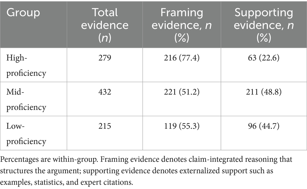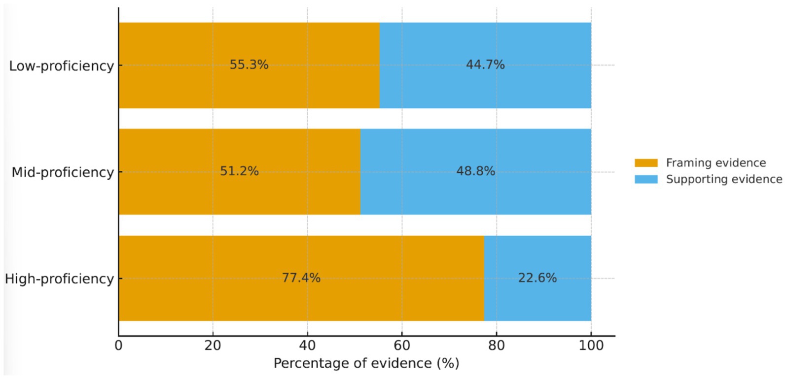 Results: Overall, framing evidence predominated. The mid-proficiency group showed the most balanced framing–supporting configuration; the low-proficiency group was weak on both types of evidence. Stratified regressions indicated that only in the mid-proficiency group did evidence type significantly predict writing scores (β ≈ 0.40, 95% CI ≈ 0.19–0.62); effects in other groups were not robust, and model fit was modest (low–moderate R2).