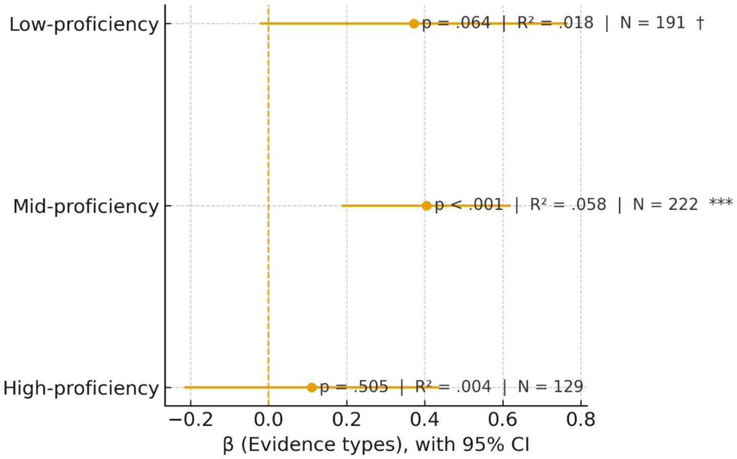 Figure 3 shows the regression coefficients (β) of writing score on evidence types (EviT) for each proficiency group, with 95% confidence intervals. The vertical dashed line at zero marks β = 0 (no effect), and annotations report the p values, R2, and sample sizes. Significance codes: † p < 0.10, * p < 0.05, ** p < 0.01, *** p < 0.001.