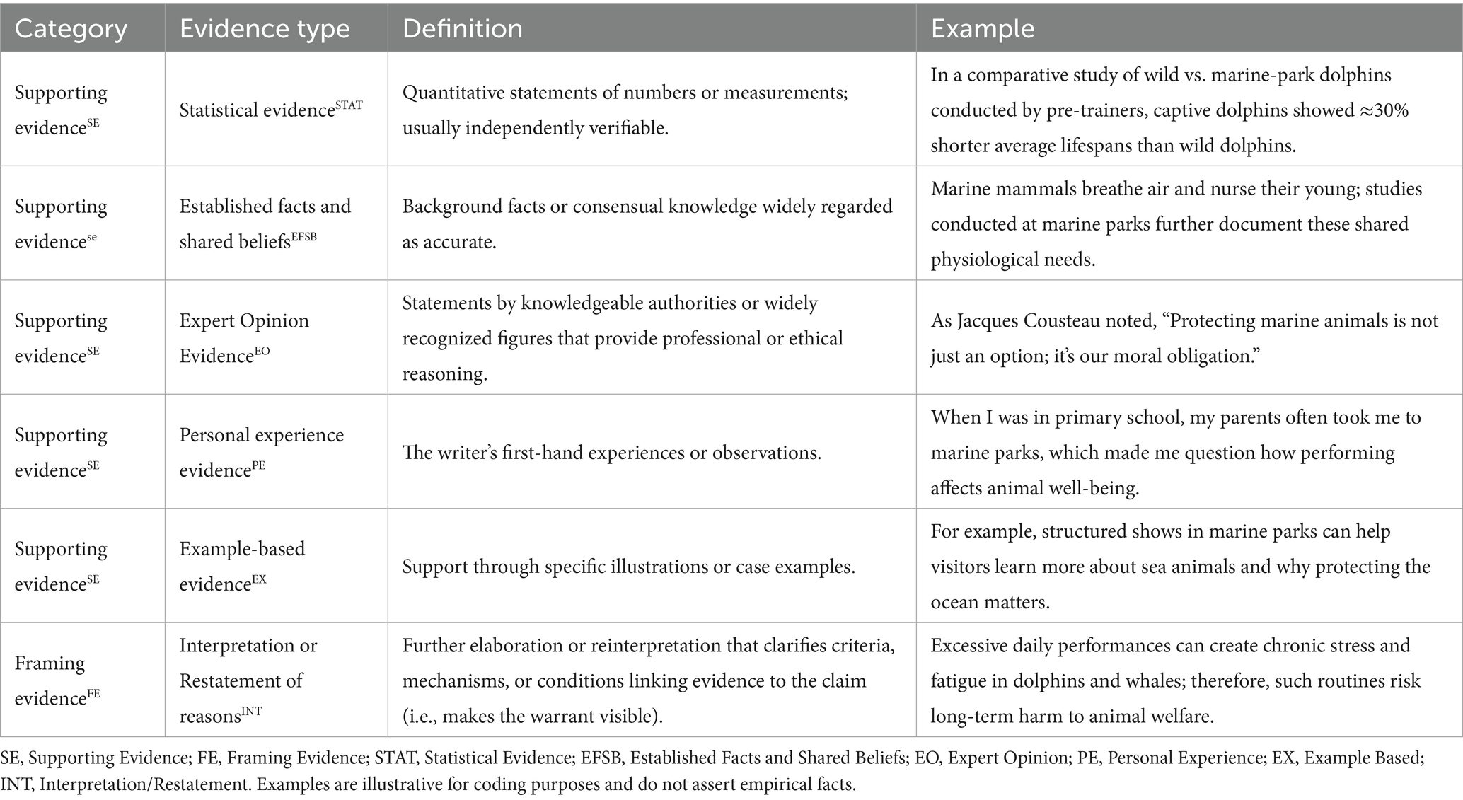 Drawing on Zarefsky (2019) and Hornikx (2008), and incorporating Du and List’s (2021) surface–deep distinction, evidence was classified into two levels and six categories: