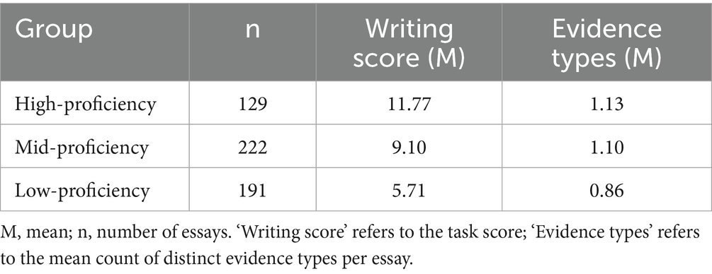 Table 2 shows that the essay scores for the high-, mid-, and low-proficiency groups (n = 129, 222, 191) are 11.77, 9.10, and 5.71, respectively, exhibiting a clear downward trend. The mean number of evidence types likewise decreases with score: 1.13 in the high group and 1.10 in the mid group (comparable), but only 0.86 in the low group—substantially fewer—indicating that the richness of evidence types declines with writing quality.