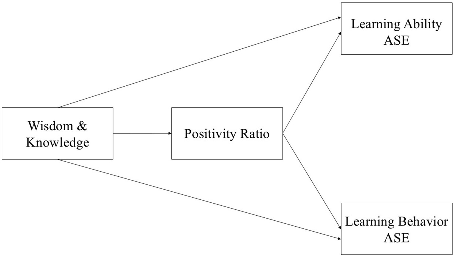 The objective of this study is to: Firstly, it is necessary to elucidate the manner in which wisdom and knowledge strengths influence ASE through affective balance. Secondly, it is imperative to examine whether the mediating effect of positive affect differs between learning ability and behavior efficacy. Thirdly, the robustness of these relationships must be tested using both ratio- and difference-based affect indicators. In accordance with these objectives, the following three hypotheses were proposed: