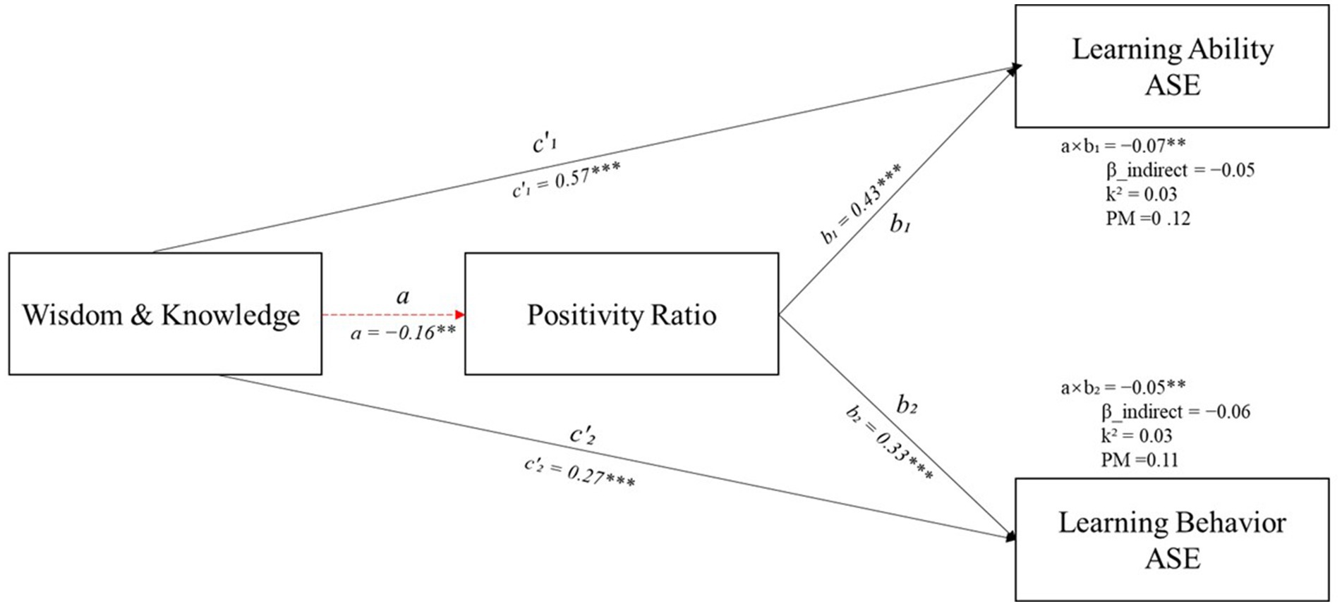 As shown in Figure 2, we specified a mediation model with VIA-IS Wisdom and Knowledge as the predictor (X), the positivity ratio as the mediator (M), and Learning Ability ASE (Y₁) and Learning Behavior ASE (Y₂) as the outcomes. The a path was negative (β = −0.11, p = 0.010), whereas both b paths were positive and significant (Y₁: β = 0.47, p < 0.001; Y₂: β = 0.55, p < 0.001). The corresponding unstandardized indirect effects were significantly adverse—Y₁: a × b = −0.07, 95% CI (−0.1130, −0.03); Y₂: a × b = −0.05, 95% CI (−0.09, −0.02)—indicating inconsistent (competitive) mediation. In addition, the GLM slope comparison showed a significant difference between the 2 b paths [Δ = 0.10, 95% CI (0.05, 0.14), p < 0.001], such that the effect of the positivity ratio on Y₁ exceeded that on Y₂. The mediation model path diagram is illustrated in Figure 3. As illustrated in Figure 3, the red dashed line signifies the negative mediating path (path a), while the black solid line denotes the positive main path and path b. The figure visually summarizes the key results reported in Sections 3.3 and 3.4: H2 was supported (both indirect effects were significant), and H3 was supported (the two b paths differed significantly in magnitude).