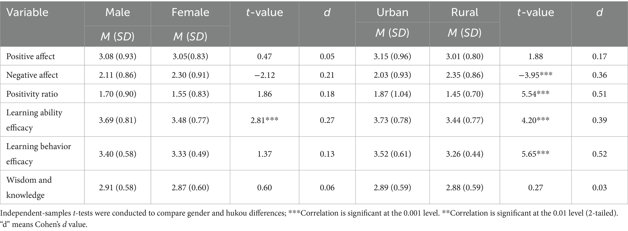 According to predefined inclusion and exclusion criteria—(i) incomplete responses, (ii) response time less than 50% of the sample median, and (iii) straight lining within any scale—57 responses were excluded, yielding a final valid sample of 531 out of 588 participants. The sample consisted of 145 males (27.31%) and 386 females (72.69%). Regarding household registration, 179 students (33.71%) reported an urban hukou and 352 students (66.29%) reported a rural hukou. The gender imbalance reflects the overrepresentation of female students in education- and psychology-related majors in Chinese universities and should be considered when interpreting generalizability. Preliminary t-tests analyses revealed no significant mean differences in key study variables between gender and hukou groups (ps > 0.05, ds < 0.40). These results are shown at Table 1, which suggest that the main variables remained consistent across demographic subgroups, which supports the generalizability of subsequent analyses. Table 1 presents the descriptive statistics and group comparisons by gender and hukou status. Convenience sampling may also limit representativeness, though the sample size was sufficient for mediation testing. A priori sensitivity checks indicated that with N = 531 and α = 0.05, the study had >0.95 power to detect small-to-medium indirect effects in simple mediation (Fritz and MacKinnon, 2007).