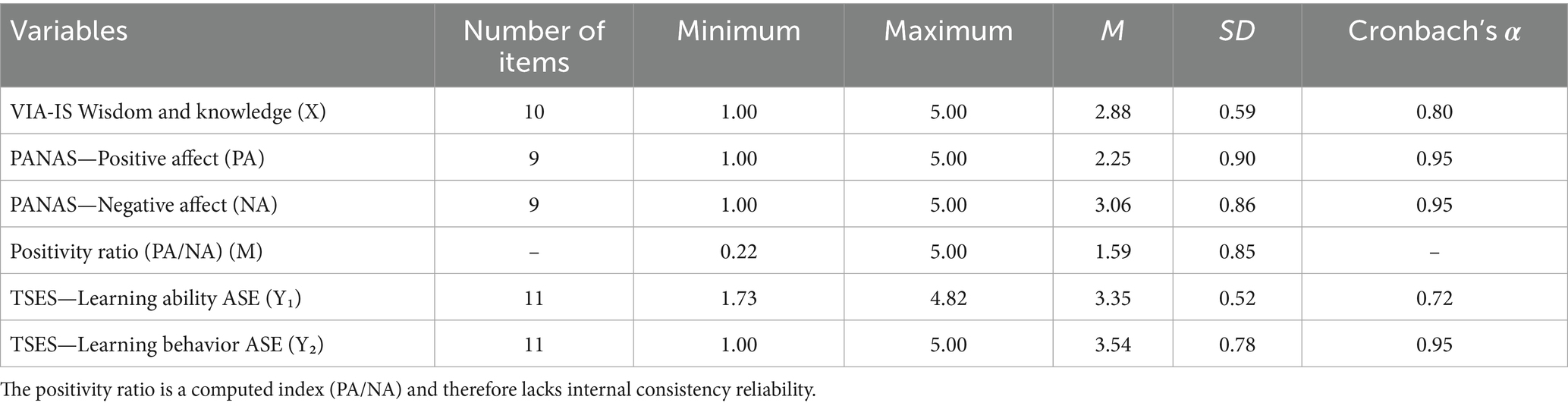 Six continuous variables were analyzed: VIA-IS Wisdom and Knowledge (X), PANAS Positive Affect (PA), PANAS Negative Affect (NA), the Positivity Ratio (M = PA/NA), TSES Learning Ability ASE (Y₁), and TSES Learning Behavior ASE (Y₂). Descriptive statistics are presented in Table 2. Mean values were as follows: Wisdom and Knowledge (M = 2.88, SD = 0.59), PA (M = 2.25, SD = 0.90), NA (M = 3.06, SD = 0.86), Positivity Ratio (M = 1.59, SD = 0.85), Learning Ability ASE (M = 3.35, SD = 0.52), and Learning Behavior ASE (M = 3.54, SD = 0.78). Internal consistency was acceptable to excellent for all multi-item scales: α = 0.80 for Wisdom and Knowledge, α = 0.95 for PA, α = 0.95 for NA, α = 0.72 for Learning Ability ASE, and α = 0.95 for Learning Behavior ASE. The reliability of the ASE Learning Ability subscale (α = 0.72) was comparatively low in relation to other instruments. While this finding remains within the established “acceptable” parameters, it has the potential to compromise the precision of the estimate. The positivity ratio is a computed index (PA/NA) and therefore lacks internal consistency reliability. Skewness values ranged from −0.42 to 0.88, and kurtosis values from −0.31 to 0.95, indicating approximate normality. No univariate outliers were identified, and multicollinearity diagnostics showed tolerance >0.20 and VIF < 5 (Field, 2024). Visual inspection of distributions (skewness, kurtosis, and Q–Q plots) revealed no substantial deviations from normality, supporting the use of Pearson correlations, regression analyses, mediation models, and multivariate GLM.