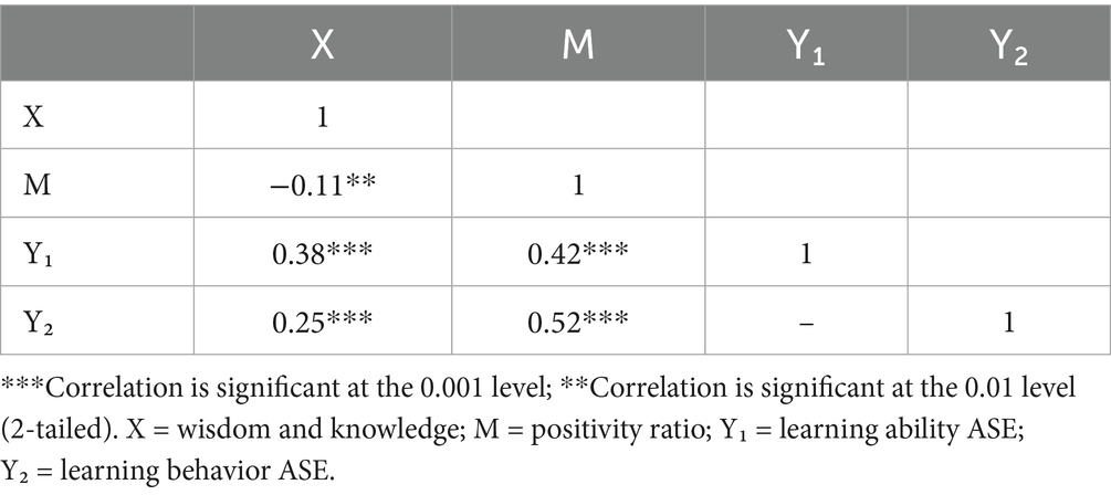 Table 3. Correlations among wisdom and knowledge (X), positivity ratio (M), learning ability ASE (Y₁), and learning behavior ASE (Y₂) (n = 531).