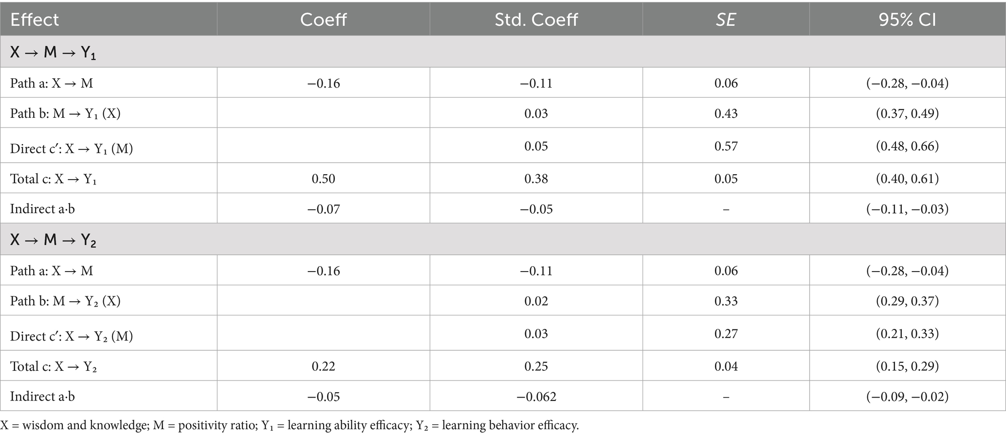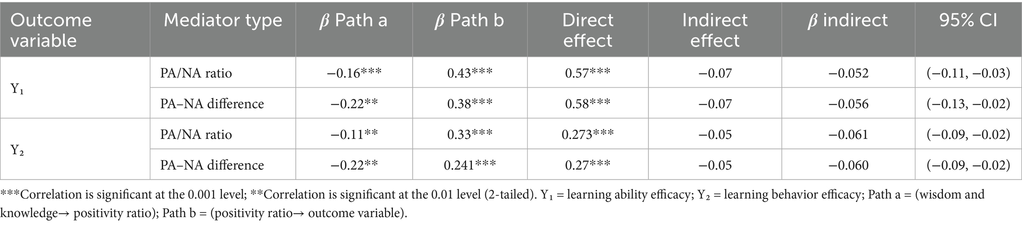 In terms of effect size, the inconsistent mediation for Y₁ (a·b = −0.07, β = −0.052) was in the “small-to-medium” range, while the effect for Y₂ (a·b = −0.05, β = −0.062) also fell within the “small-to-medium” range (Cohen, 2013). To provide standardized effect size benchmarks, the indirect effect for Y₁ corresponded to β = −0.052, k2 = 0.032, and PM = 0.12, indicating that approximately 12% of the total effect of wisdom and knowledge on ability efficacy was transmitted through affective balance. This indicates that although direct positive effects of Wisdom and Knowledge on ASE remain strong, the emotional pathway partially inhibits the total effect, reducing overall magnitude (Zhao et al., 2010).