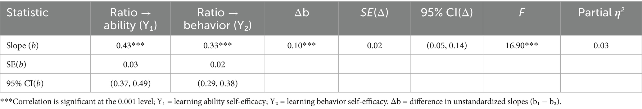 The slope difference effect size (partial η2 = 0.03) falls in the “small-to-medium” range (Cohen, 2013), but is educationally meaningful. Statistical significance does not necessarily imply practical importance. In real educational settings, this indicates that differences in emotional influence across ASE domains are noticeable but modest—enhancing positive affect may help students’ perceived learning ability somewhat more than behavioral control, yet the magnitude of this advantage remains relatively limited.