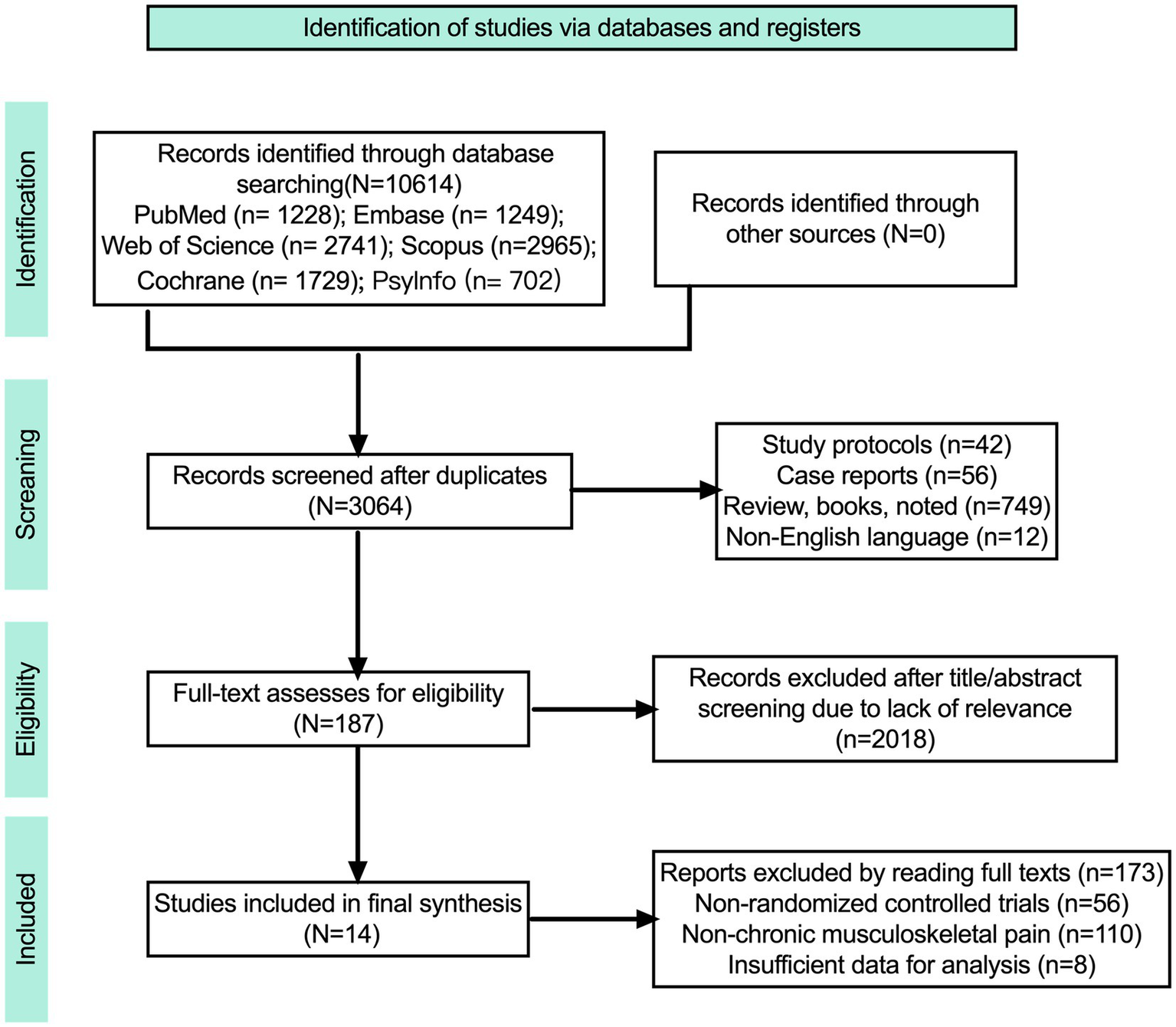 A preliminary search of six academic databases retrieved a total of 10,614 articles: PubMed (n = 1,228), Scopus (n = 2,965), Embase (n = 1,249), PsyInfo (n = 702), the Cochrane Library (n = 1,729), and Web of Science (n = 2,741). Duplicates were removed, and 3,064 articles remained for title and abstract screening. Subsequently, 187 potentially eligible articles were reviewed in full text, ultimately resulting in the inclusion of 14 studies. The literature screening process was independently conducted by two researchers, with any disagreements resolved by a third researcher. The screening process is detailed in the PRISMA flow diagram (Figure 1).