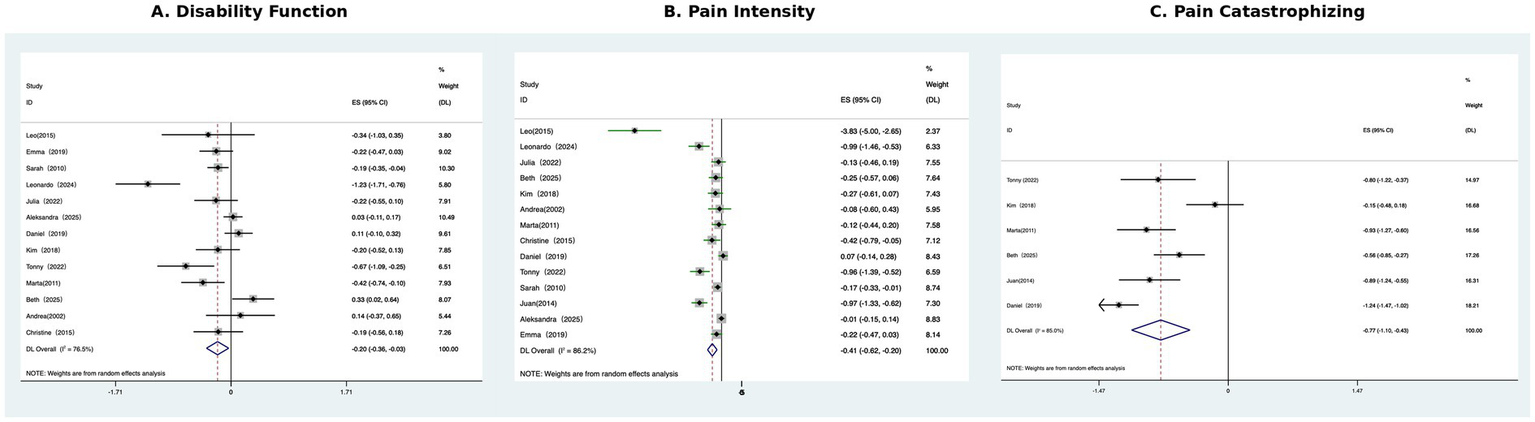 Fourteen high-quality RCTs involving 2,677 patients were included. Meta-analysis indicated that CBT significantly reduced pain catastrophizing (SMD = −0.77, 95% CI: −1.10 to −0.43, p < 0.05), pain intensity (SMD = −0.41, 95% CI: −0.62 to −0.20, p < 0.05), and functional disability (SMD = −0.20, 95% CI: −0.36 to −0.03, p < 0.05). Subgroup analyses of pain intensity further identified a cluster of six studies showing consistent intervention effects (SMD = −0.22, p < 0.001), although the specific factors underlying this consistency remain unclear. Functional disability outcomes varied by measurement tool, with significant and homogeneous effects in the RMDQ subgroup (SMD = −0.21, p < 0.05) but nonsignificant, heterogeneous results in the ODI subgroup. For catastrophizing, both CBT and pain-coping skills training (PCST) significantly reduced scores (SMD = −0.74 and −0.89, respectively).