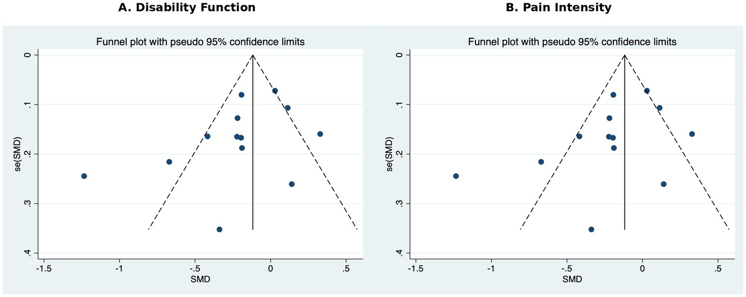 All statistical analyses were performed using STATA software (version 15). For each outcome, effect sizes were calculated as standardized mean differences (SMDs) with 95% confidence intervals. The SMDs were interpreted according to conventional thresholds, with absolute values < 0.20 considered trivial, 0.20–0.49 small, 0.50–0.79 moderate, and ≥ 0.80 large (Cohen, 1988). For the primary pain outcome, we included patient-reported measures that contained a dedicated pain domain. Trials most commonly used unidimensional pain scales such as the Numeric Pain Rating Scale (NPRS) or visual analogue scales (VAS). When multidimensional health-status instruments were used (e.g., the Arthritis Impact Measurement Scales-2 (AIMS2), the Impact of Rheumatic Diseases on General Health and Lifestyle (IRGL), or the Western Ontario and McMaster Universities Osteoarthritis Index (WOMAC), we extracted only the pain subscale scores rather than the composite total scores. The pain domains of these instruments are designed to capture the intensity and/or frequency of musculoskeletal pain over a defined recall period, and have been shown to perform comparably to unidimensional pain scales in chronic musculoskeletal conditions (Bjerre-Bastos et al., 2022). On this basis, we treated all extracted pain outcomes as conceptually similar measures of pain intensity, and used standardized mean differences (SMDs) to synthesise results across instruments with different score ranges and formats. We acknowledge, however, that residual differences in instrument content and recall period may contribute to between-study heterogeneity and this is noted in the Discussion when interpreting the pooled pain effect. Although the Pain Catastrophizing Scale (PCS) was consistently used across studies assessing catastrophizing, SMD was adopted to maintain consistency across outcomes that were measured using different instruments (e.g., VAS, NRS, MPQ for pain; ODI and RMDQ for disability) and to account for variations in PCS reporting formats (Luo et al., 2018; Shi et al., 2023). Inter-study heterogeneity was assessed using the I2 statistic, where 25, 50, and 75% represented low, moderate, and high heterogeneity, respectively. To explore the sources of heterogeneity, given sufficient data (≥2 studies per subgroup), we conducted exploratory subgroup analyses based on pre-specified categorical variables, including: type of cognitive intervention (traditional cognitive behavioral therapy versus other cognitive interventions such as acceptance and commitment therapy, cognitive-focused therapy, and cognitive behavioral support therapy), type of musculoskeletal disorder (e.g., low back pain versus other musculoskeletal pain), type of outcome measure (e.g., different pain or disability instruments) to examine whether the observed effects were consistent across measurement tools. These subgroup analyses were pre-planned to explore potential effect modifiers and were interpreted as exploratory analyses. Publication bias was assessed using funnel plots and Beg’s test (Viechtbauer, 2007). Sensitivity analysis used the leave-one-out method (Viechtbauer, 2007) to exclude individual studies one by one to assess their impact on the total effect size. In addition, outliers and data based on graphical estimates were excluded to test the robustness of the results.