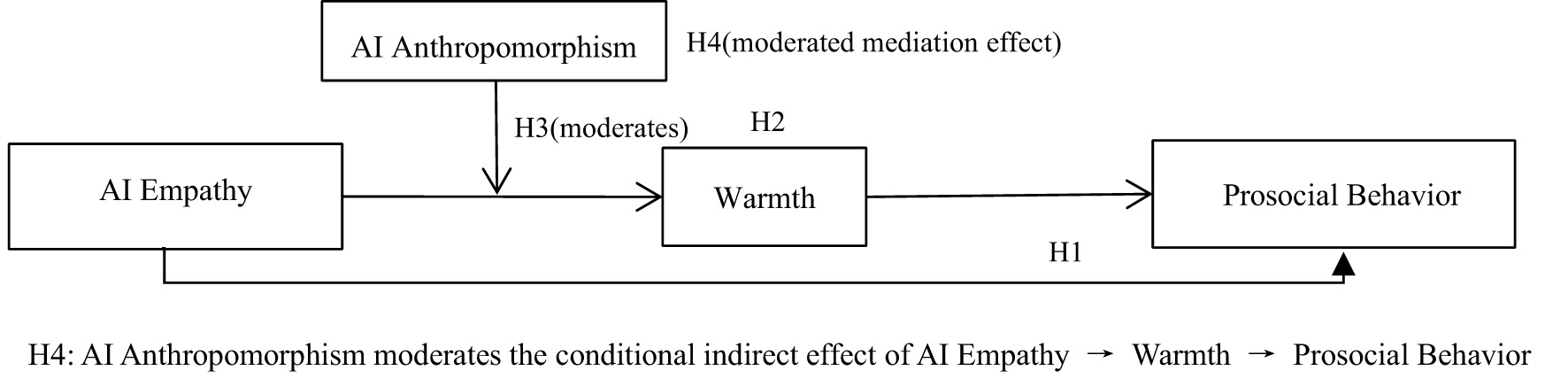 H4: AI anthropomorphism positively moderates the relationship between AI empathy perception and employee prosocial behavior through warmth, meaning that an increase in AI anthropomorphism can enhance the warmth generated by AI empathy perception, thereby increasing prosocial behavior.